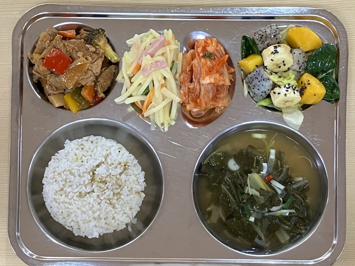 <중식> 차조밥 근대국 안심스테이크볶음 피망감자채볶음 열대과일샐러드 배추김치