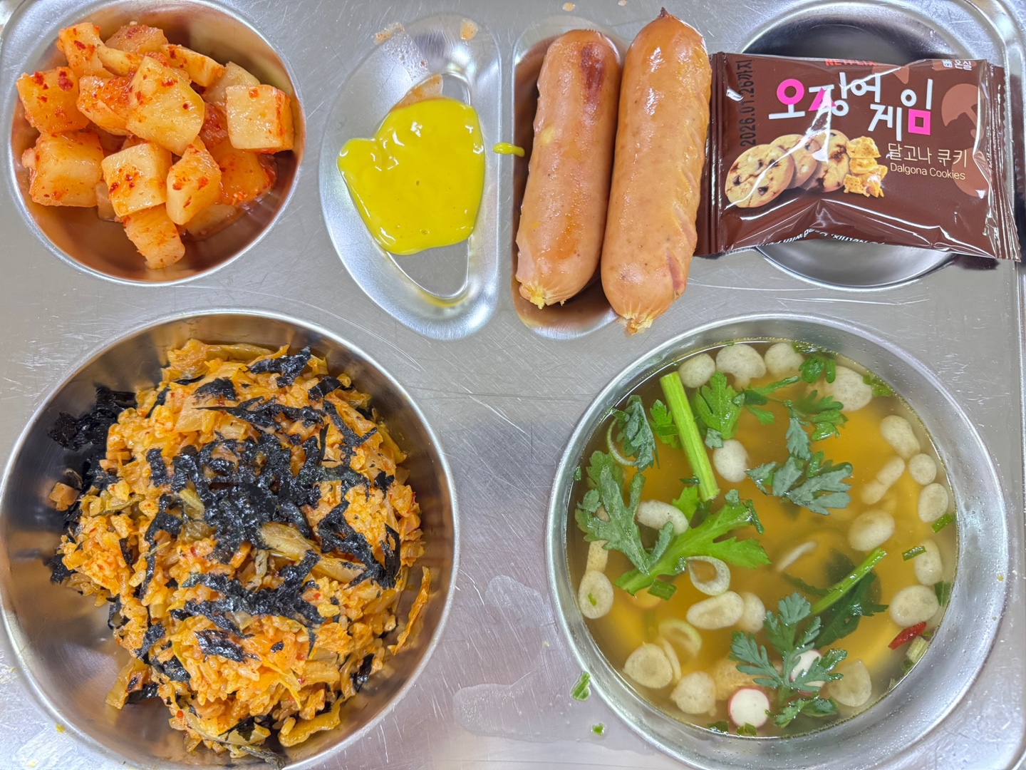 <조식> 김치볶음밥 우동국물 할라피뇨소시지구이 깍두기 달고나쿠키