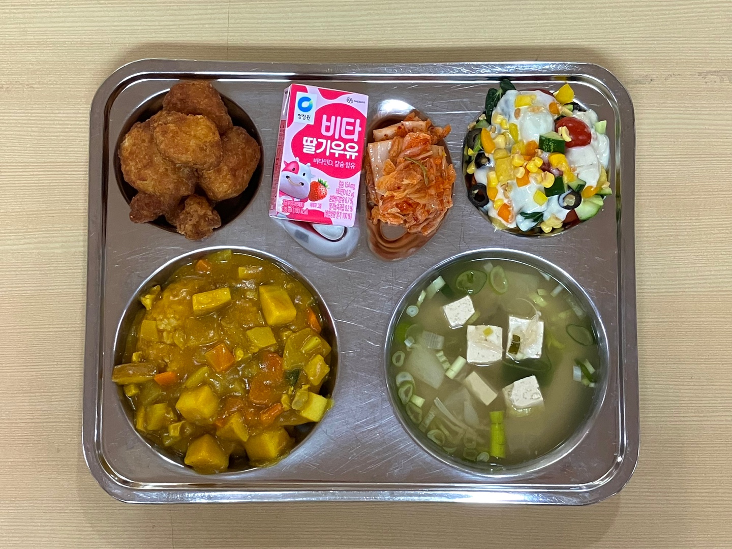 <석식>사과카레라이스 미소된장국 고메소바바치킨 콥샐러드 배추김치 비타딸기우유