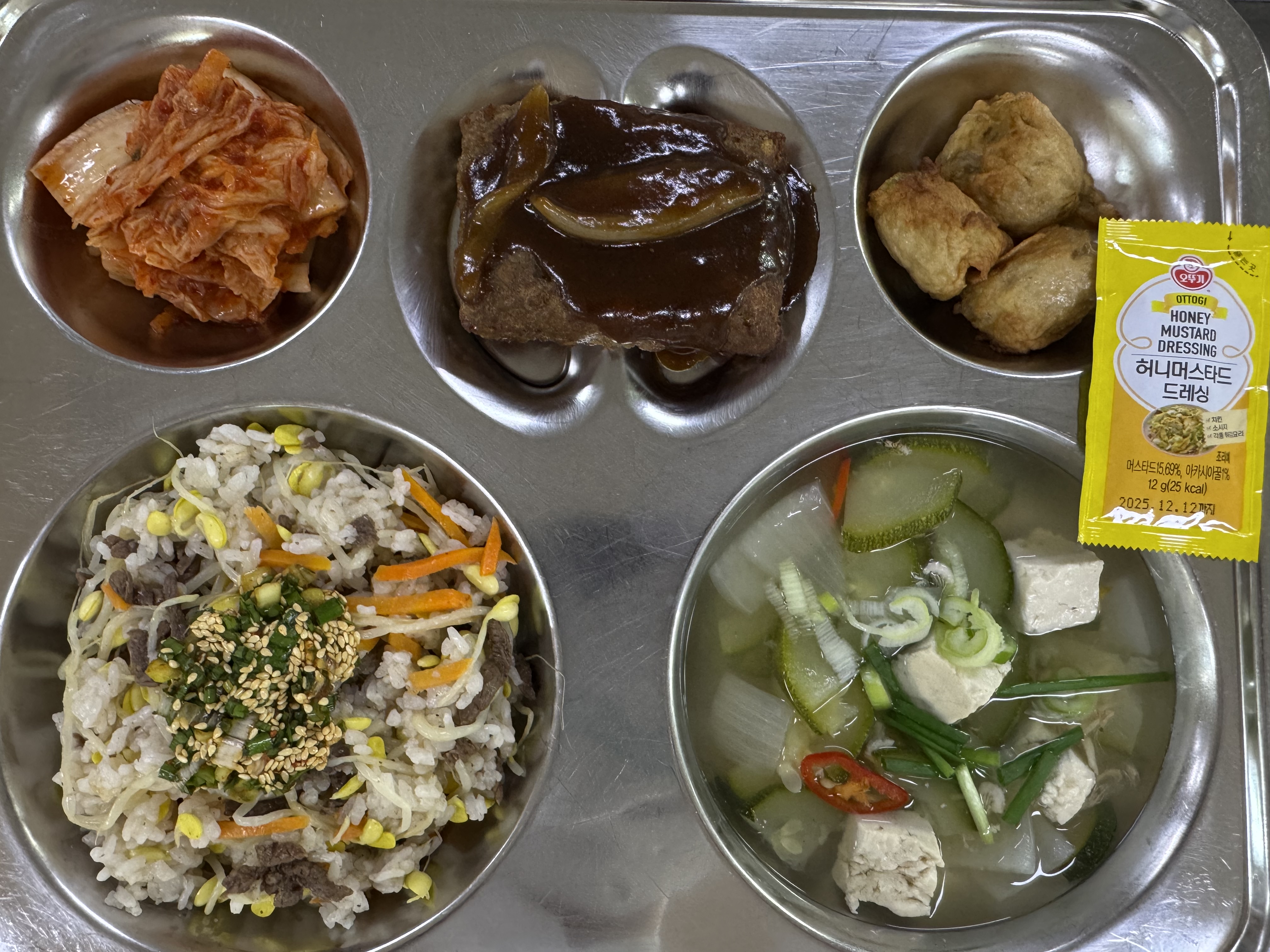<조식>소고기콩나물밥&양념장 두부맑은국 단밤떡갈비 잡채어묵&머스터드 배추김치