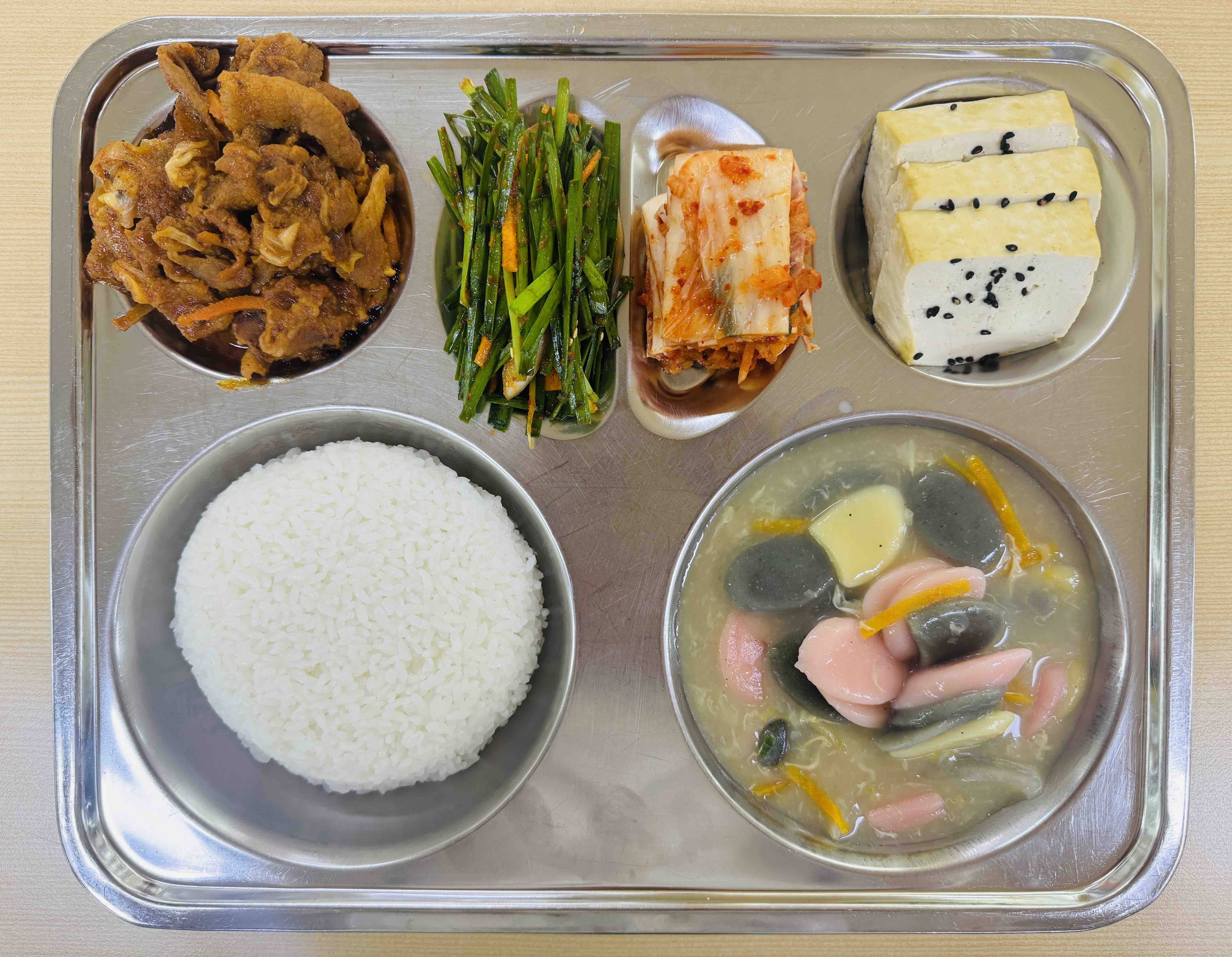 <석식>쌀밥 삼색떡국 매콤한돼지불고기 통두부구이 부추무침 배추김치