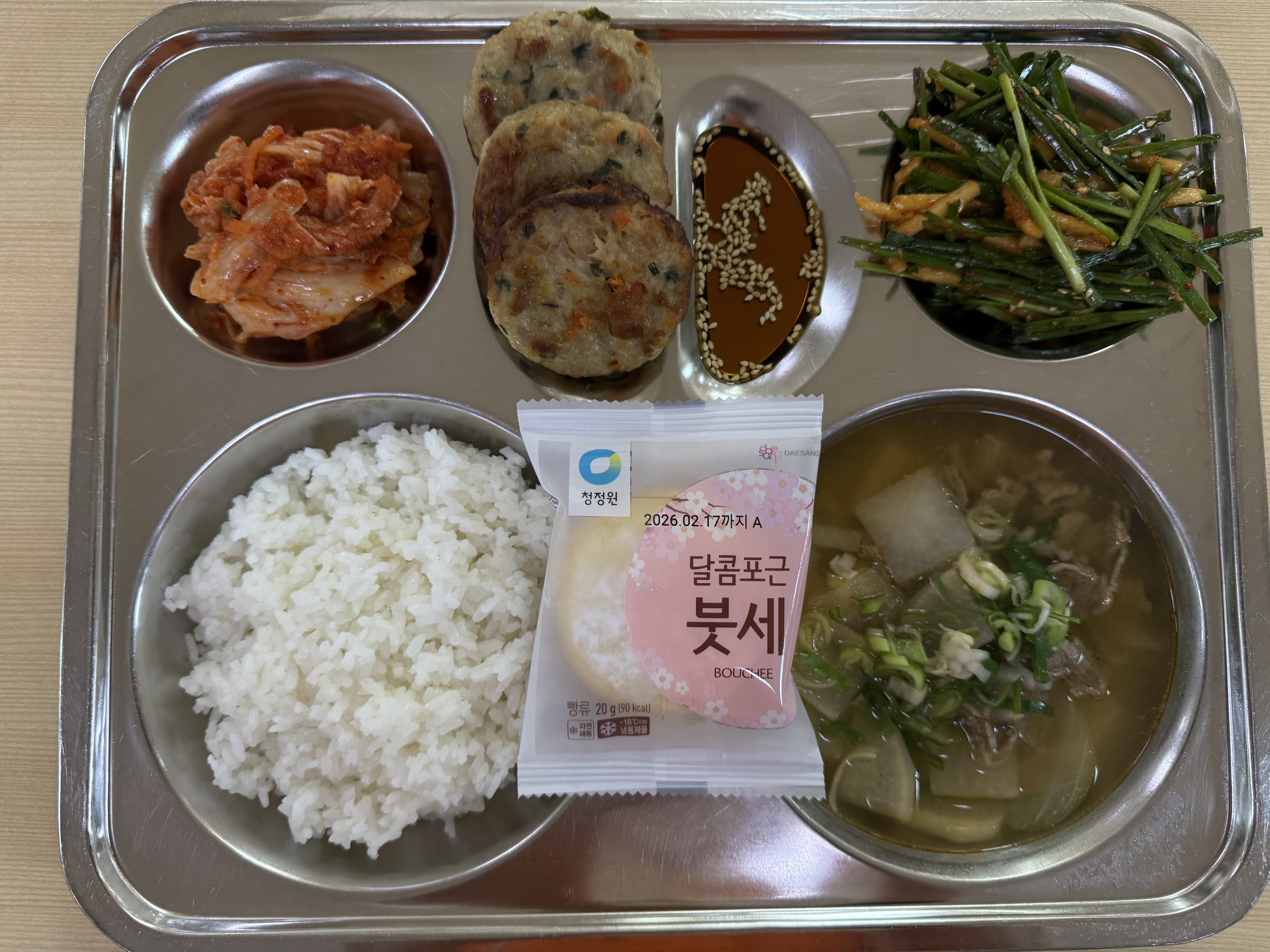 <조식>쌀밥 얼큰소고기무국 새우고기완자전 부추사과무침 배추김치 붓세