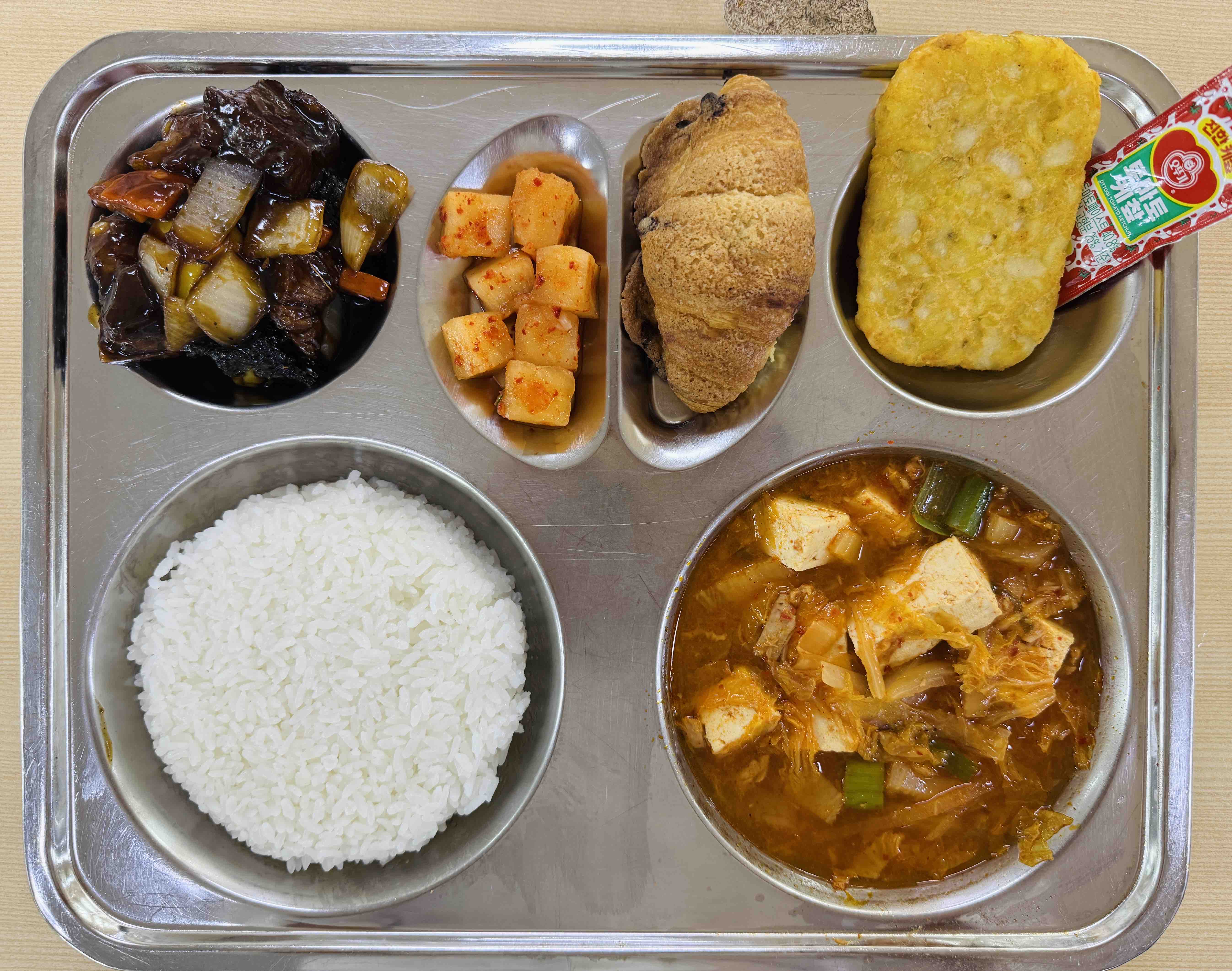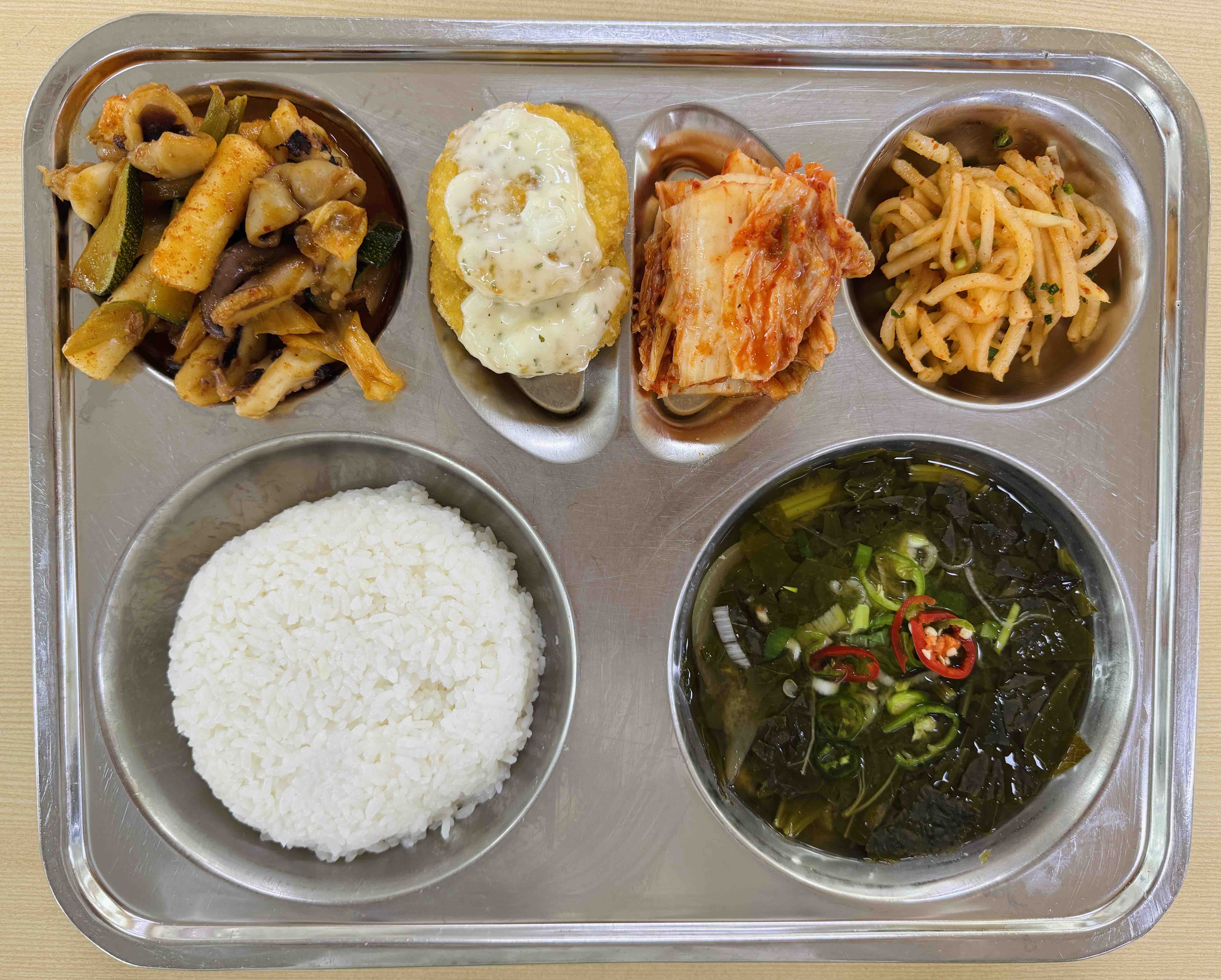 <중식>칼슘찹쌀밥 아욱된장국 주꾸미떡볶음 고감콘고로케 무생채 배추김치