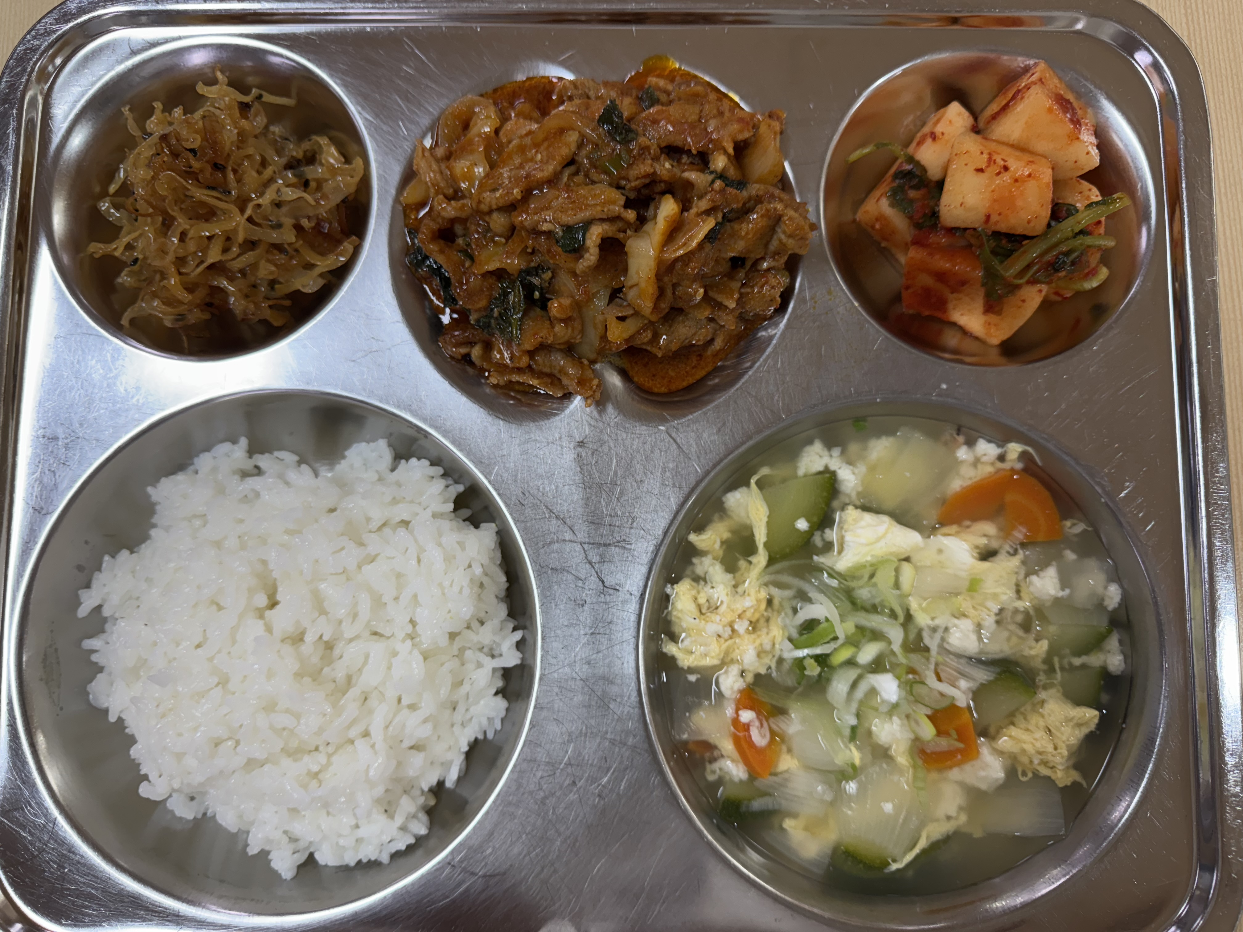 <조식>칼슘찹쌀밥 순두부맑은국 제육볶음 오징어실채볶음 알타리김치