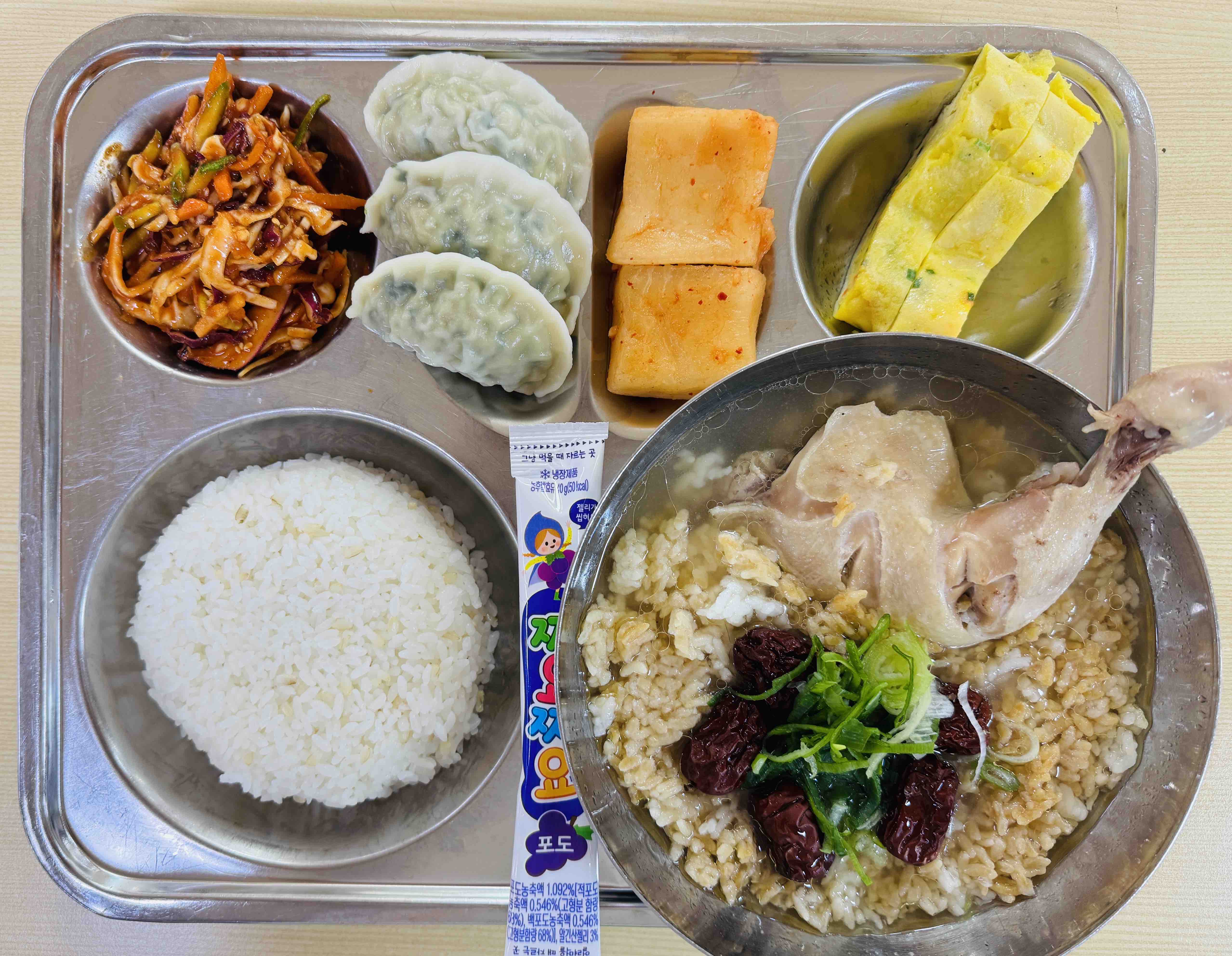 <중식>칼슘현미밥 누룽지닭백숙 납작만두 수제달걀말이 야채새콤무침 석박지 짜요짜요