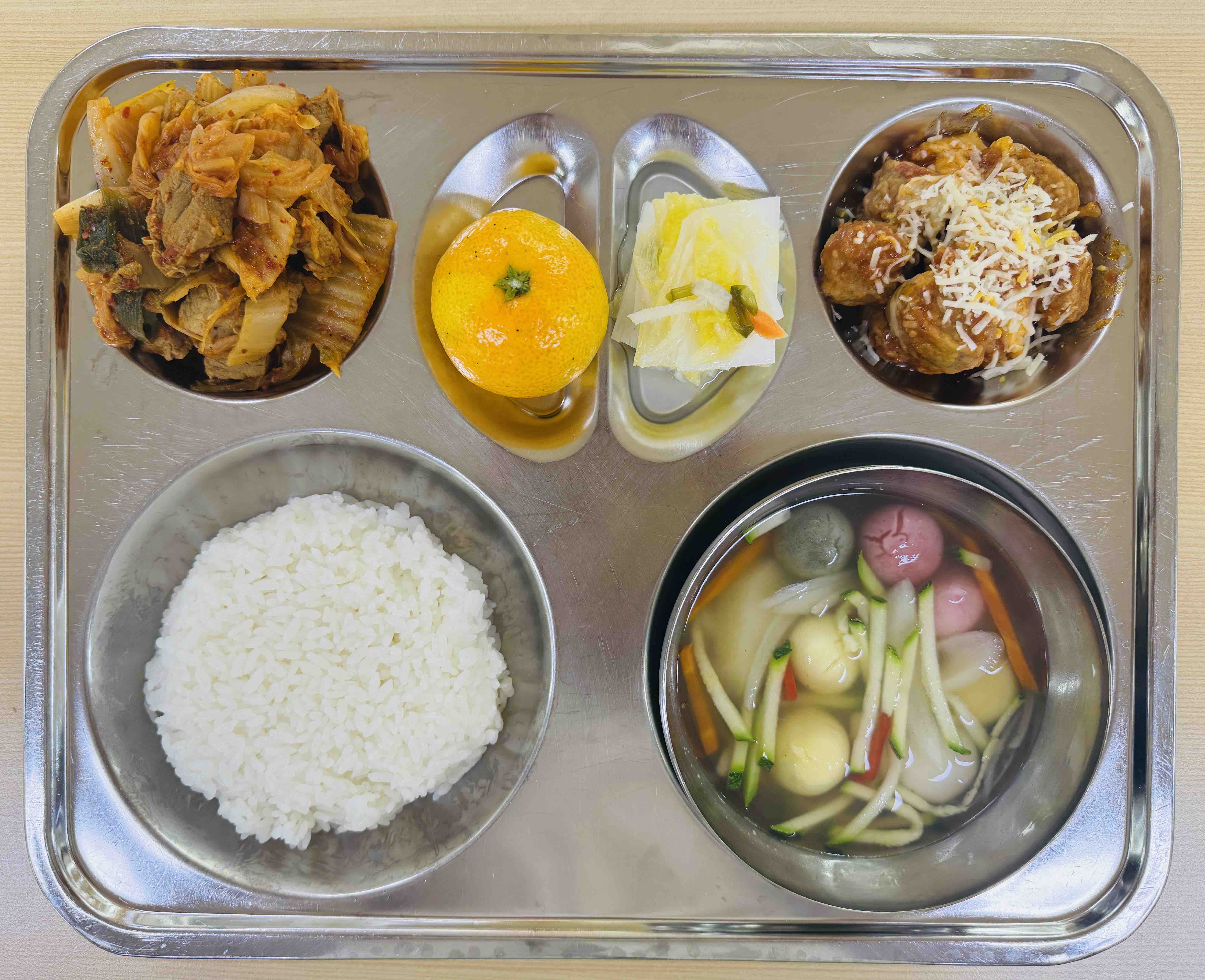<석식>백미밥 감자옹심이국 돈사태김치찜 미트볼라따뚜이 백김치 귤