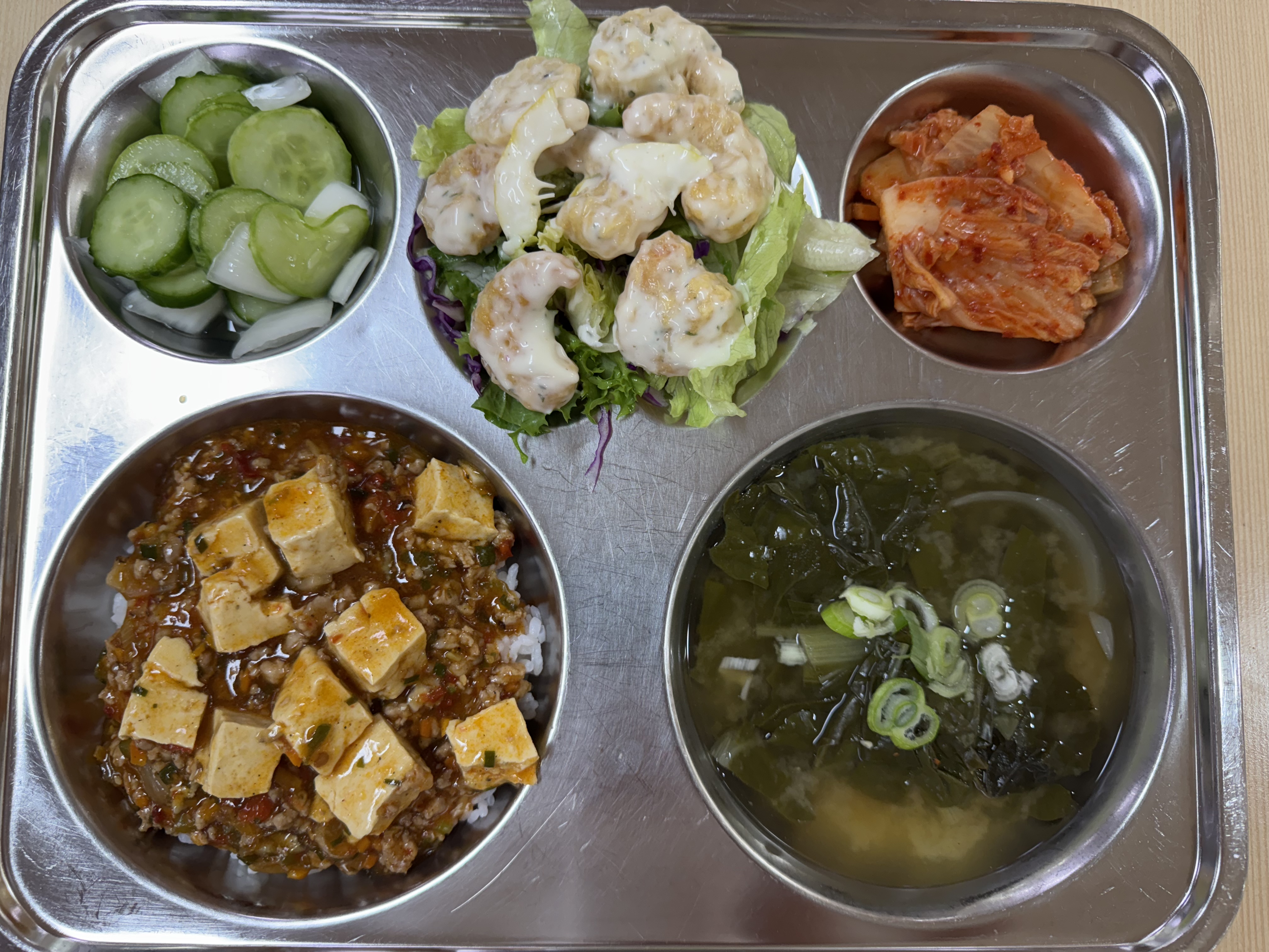 <조식>마파두부덮밥 근대된장국 레몬크림새우*야채 오이양파무침 배추김치