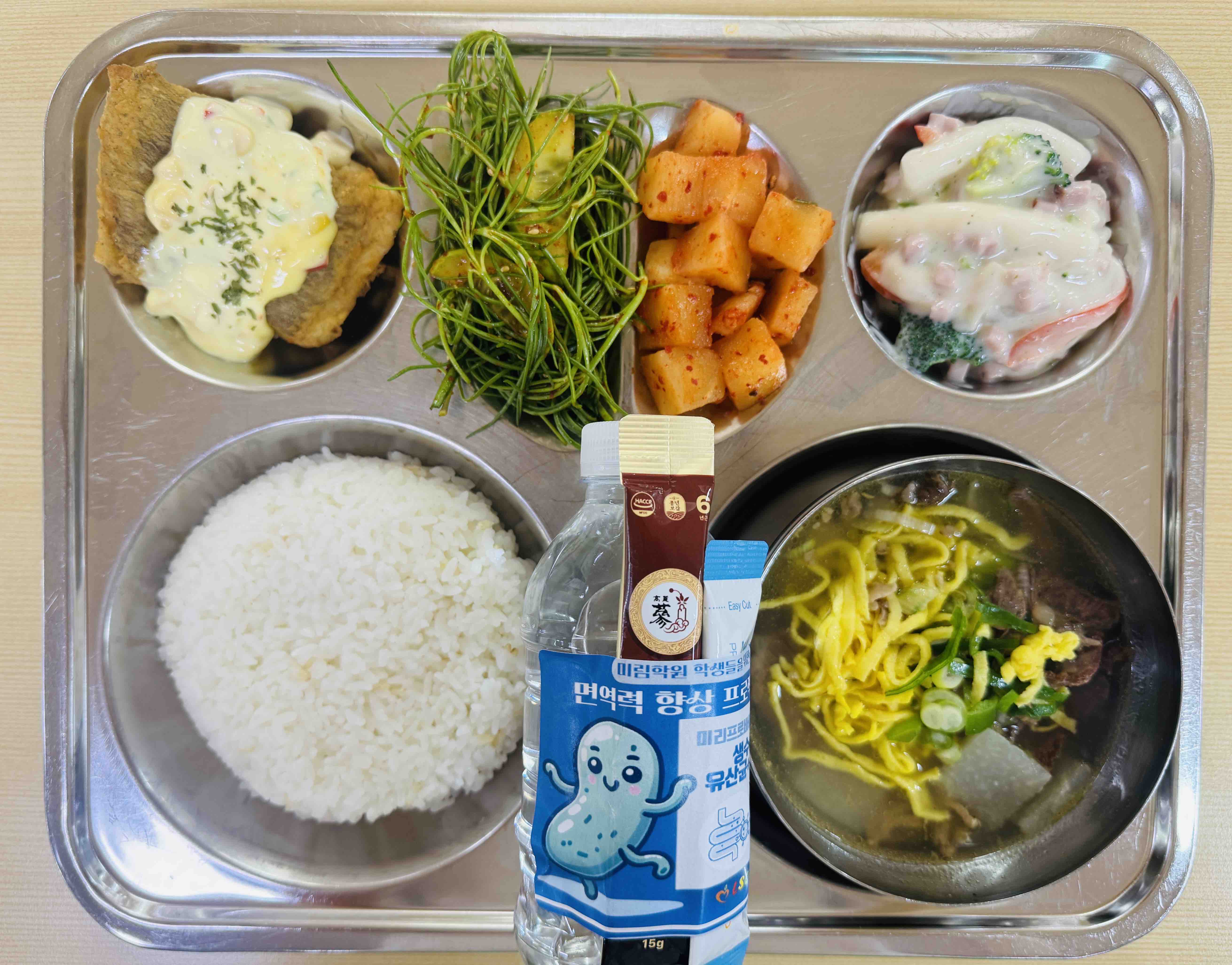 <중식>발아현미밥 나주곰탕 가자미구이&콘소스 까르보나라떡볶이 세발나물오이겉절이 깍두기