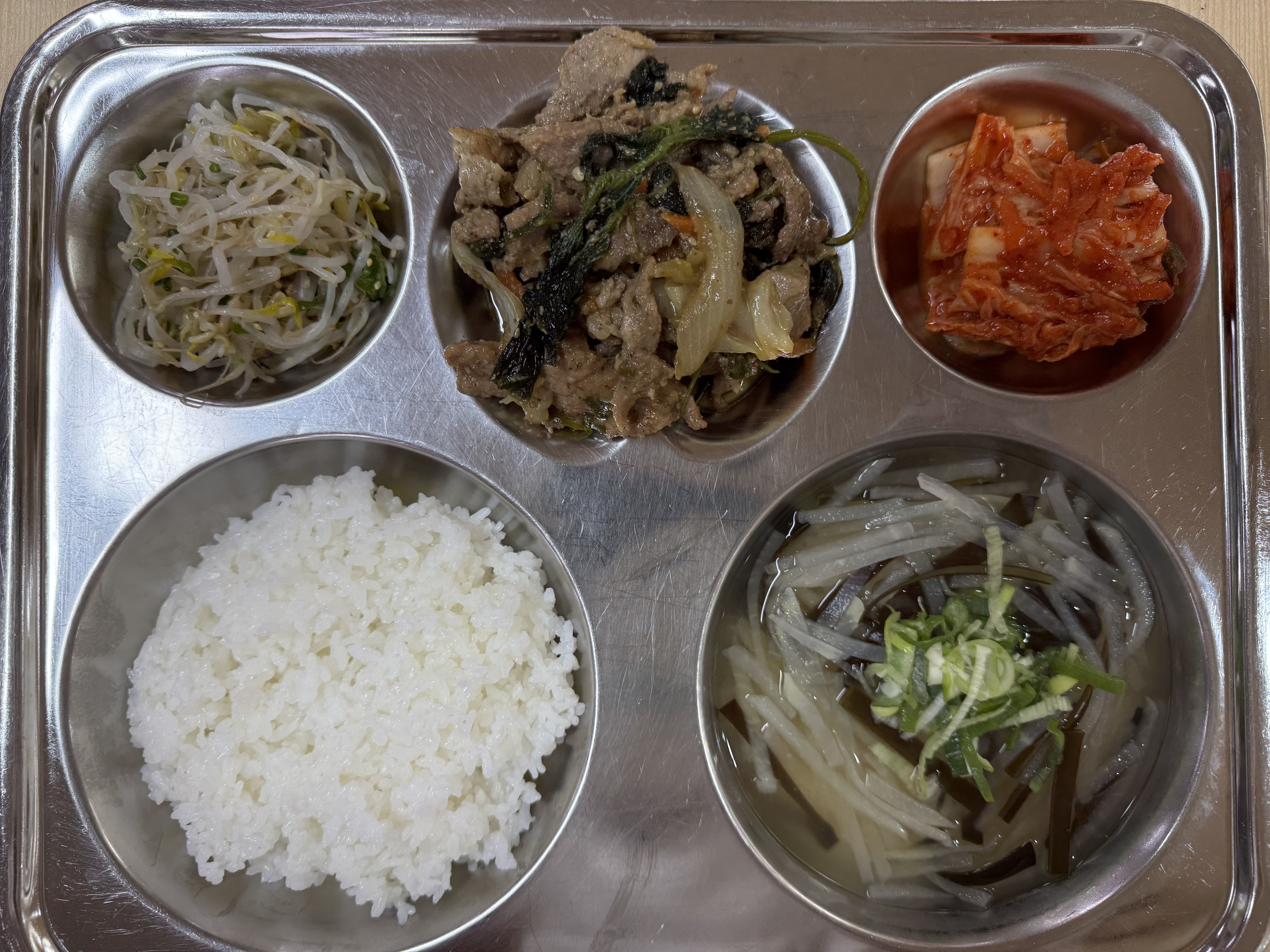 <조식>쌀밥 다시마무채국 들깨백불고기 숙주나물무침 배추김치
