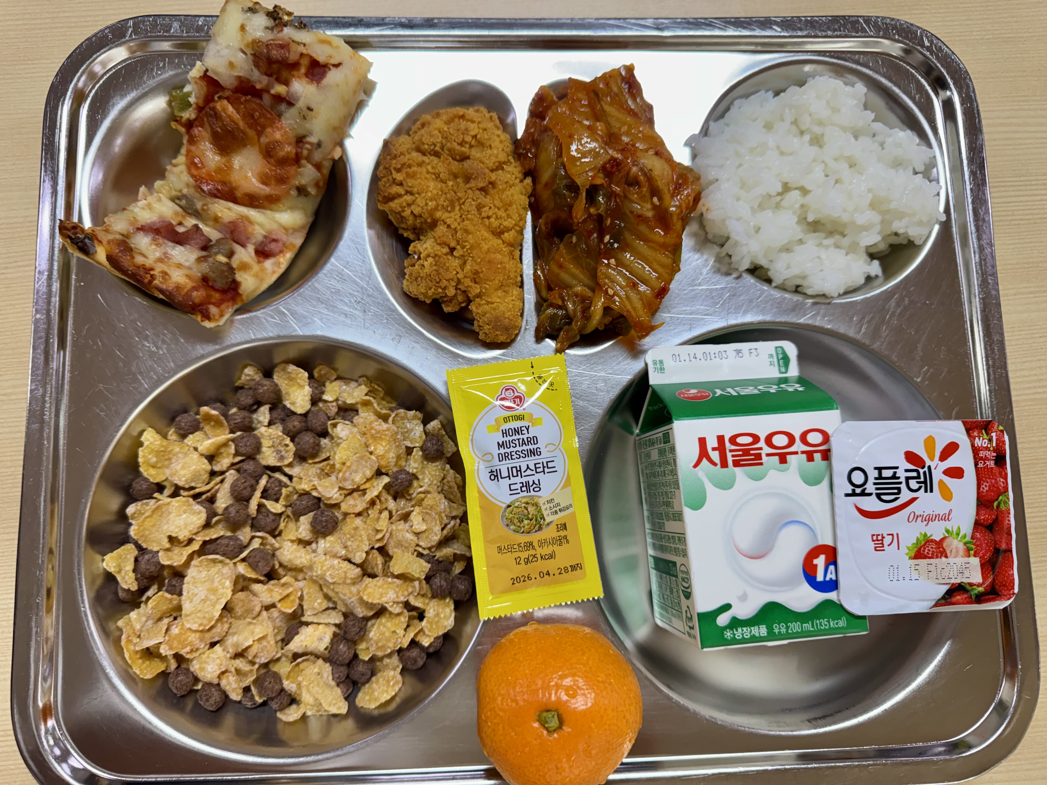 <조식>초코시리얼&우유 콤비네이션사각피자 요플레 치킨텐더 추가밥 볶음김치 귤