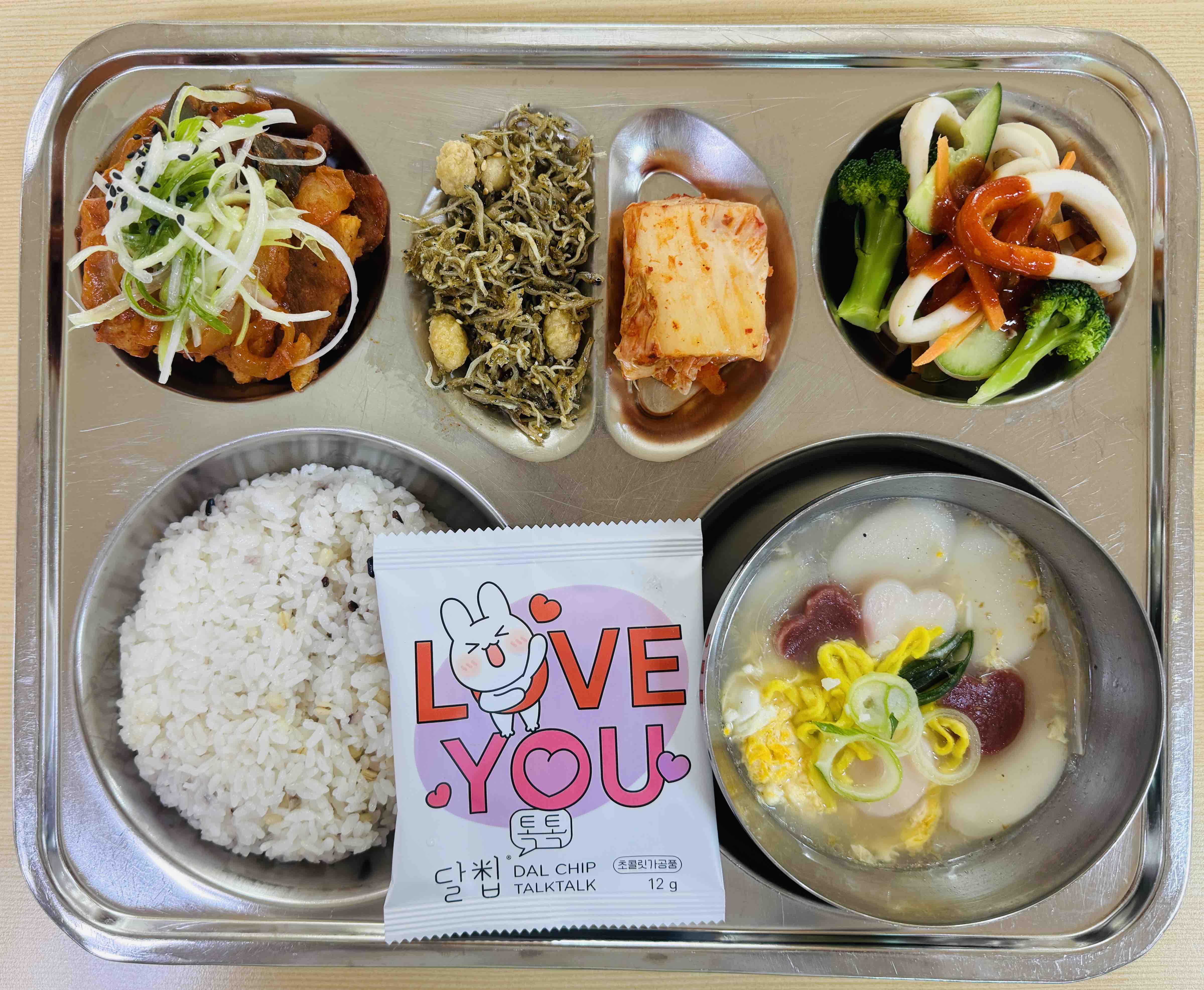 <중식>칼슘혼합잡곡밥 아이러브떡국 고추장삼겹살 브로콜리오징어초무침 멸치찹쌀콩볶음 배추김치 달칩톡톡