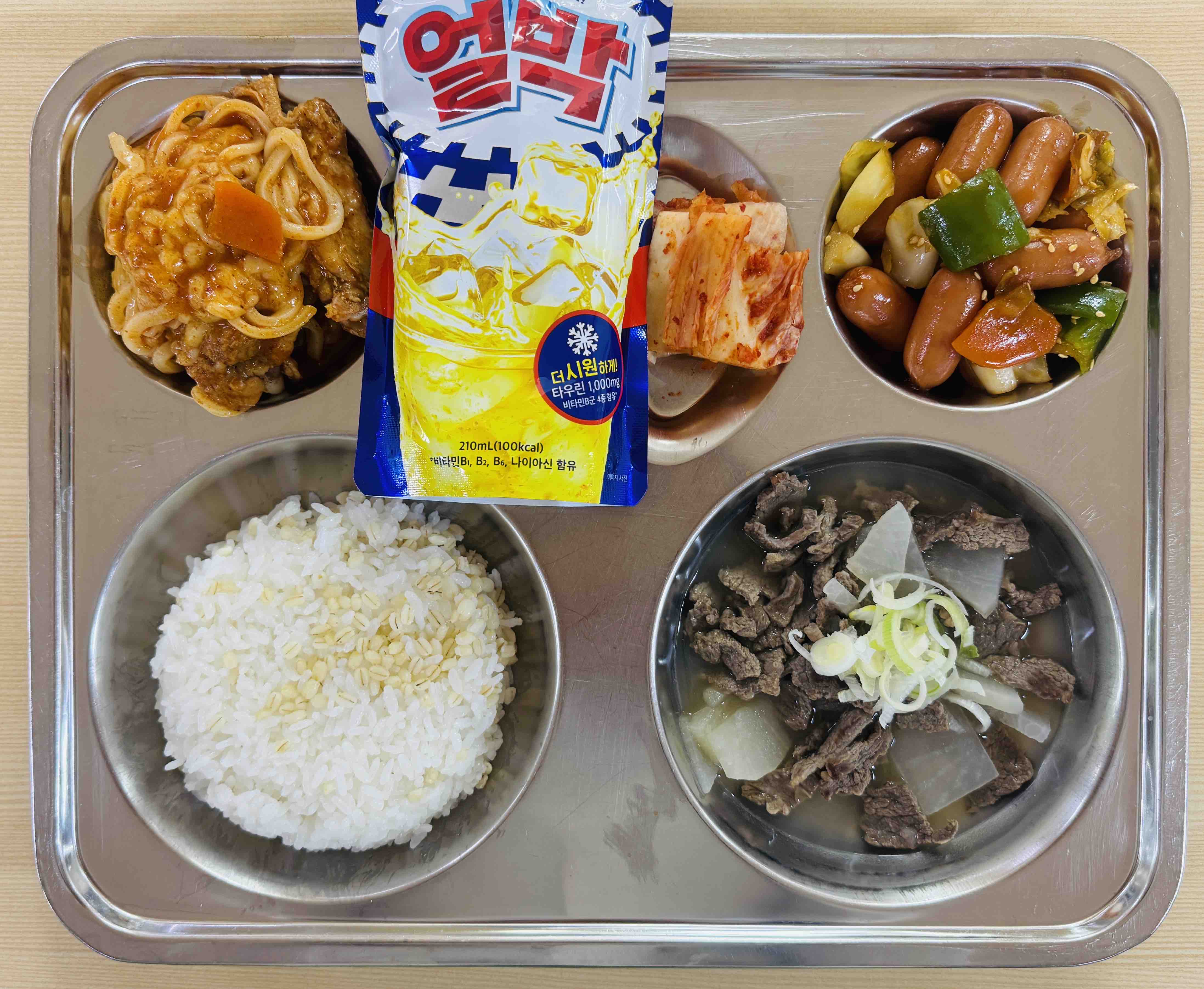 <석식>찰보리밥 소고기무국 치즈닭볶음탕&우동사리 야채비엔나볶음 배추김치 얼박