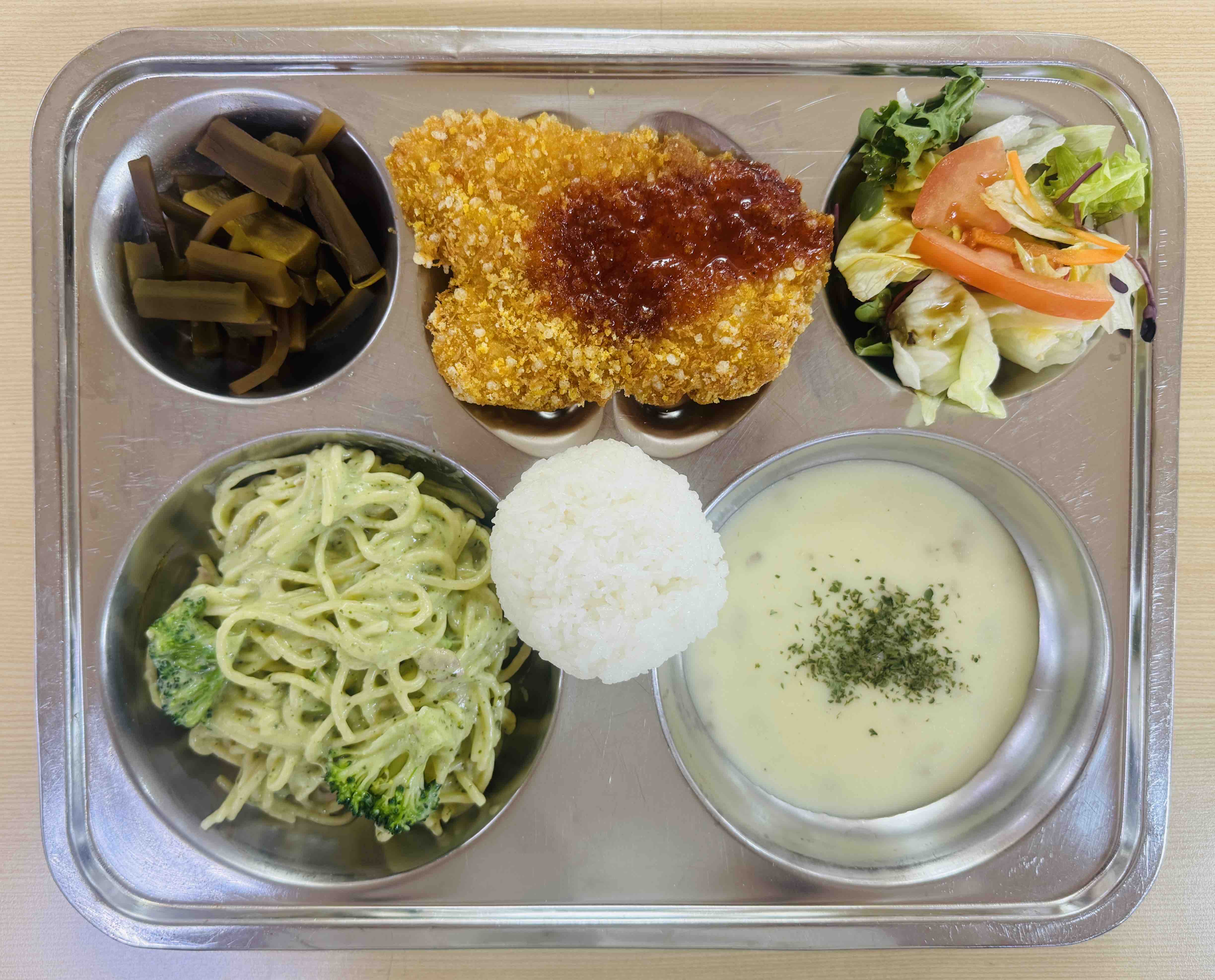 <석식>바질크림파스타 크림스프 대마왕지파이 토마토양상추샐러드 새콤궁채장아찌 배추김치