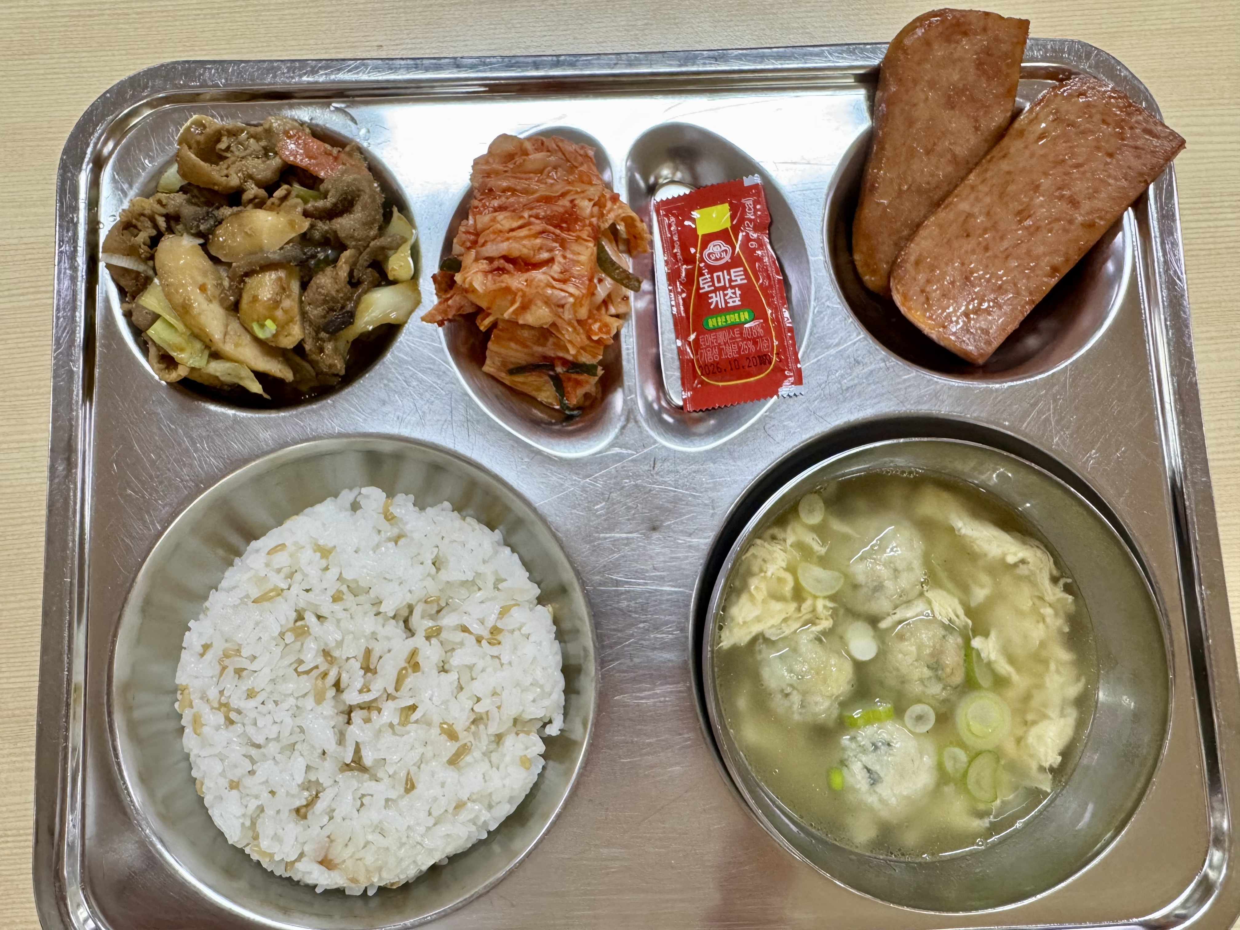 <조식>칼슘귀리밥 굴림만두국 모둠버섯불고기 스팸구이 배추김치