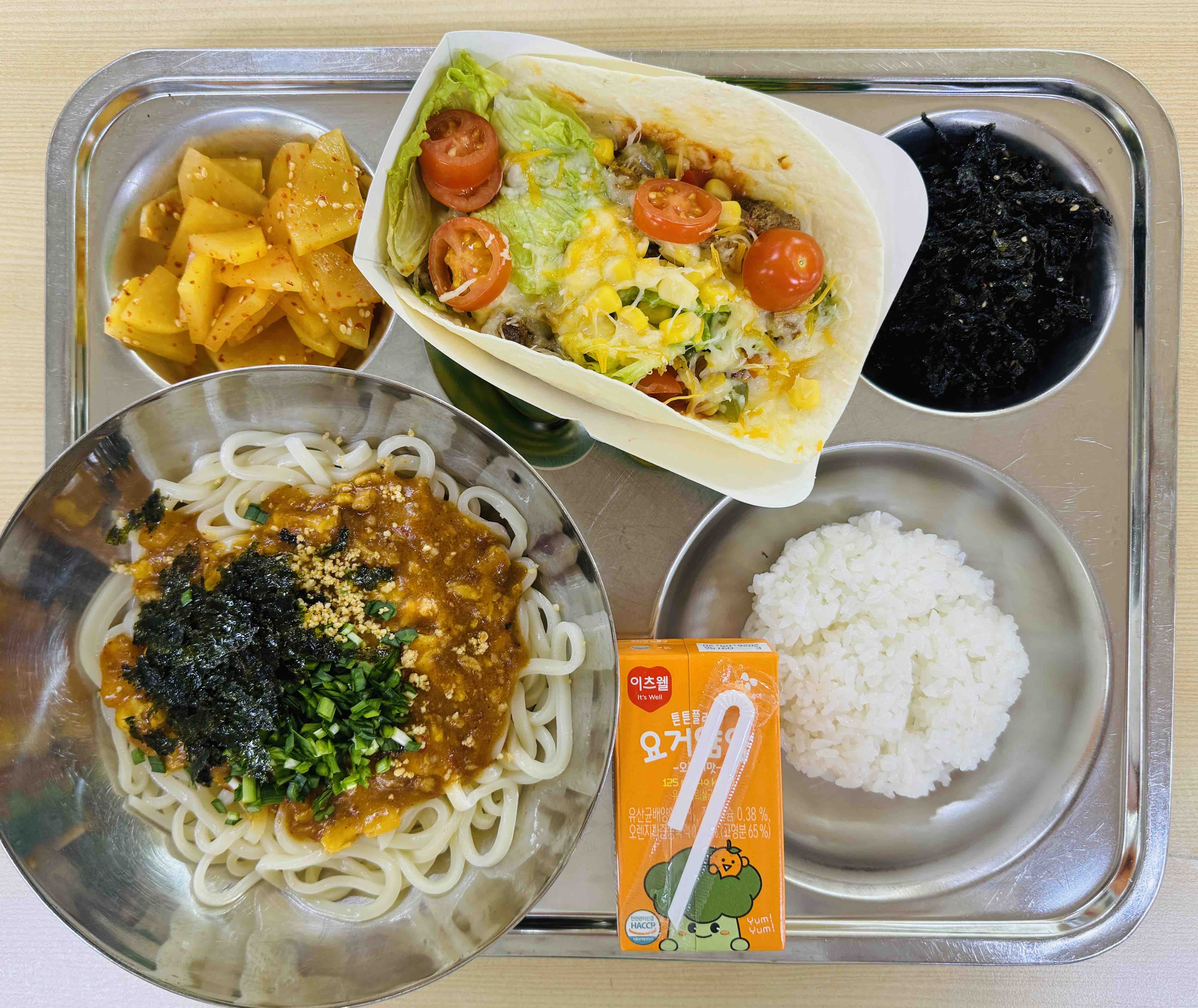 <석식>마제소바 추가밥 포크타코또띠아 단무지채무침 김자반 오렌지주스