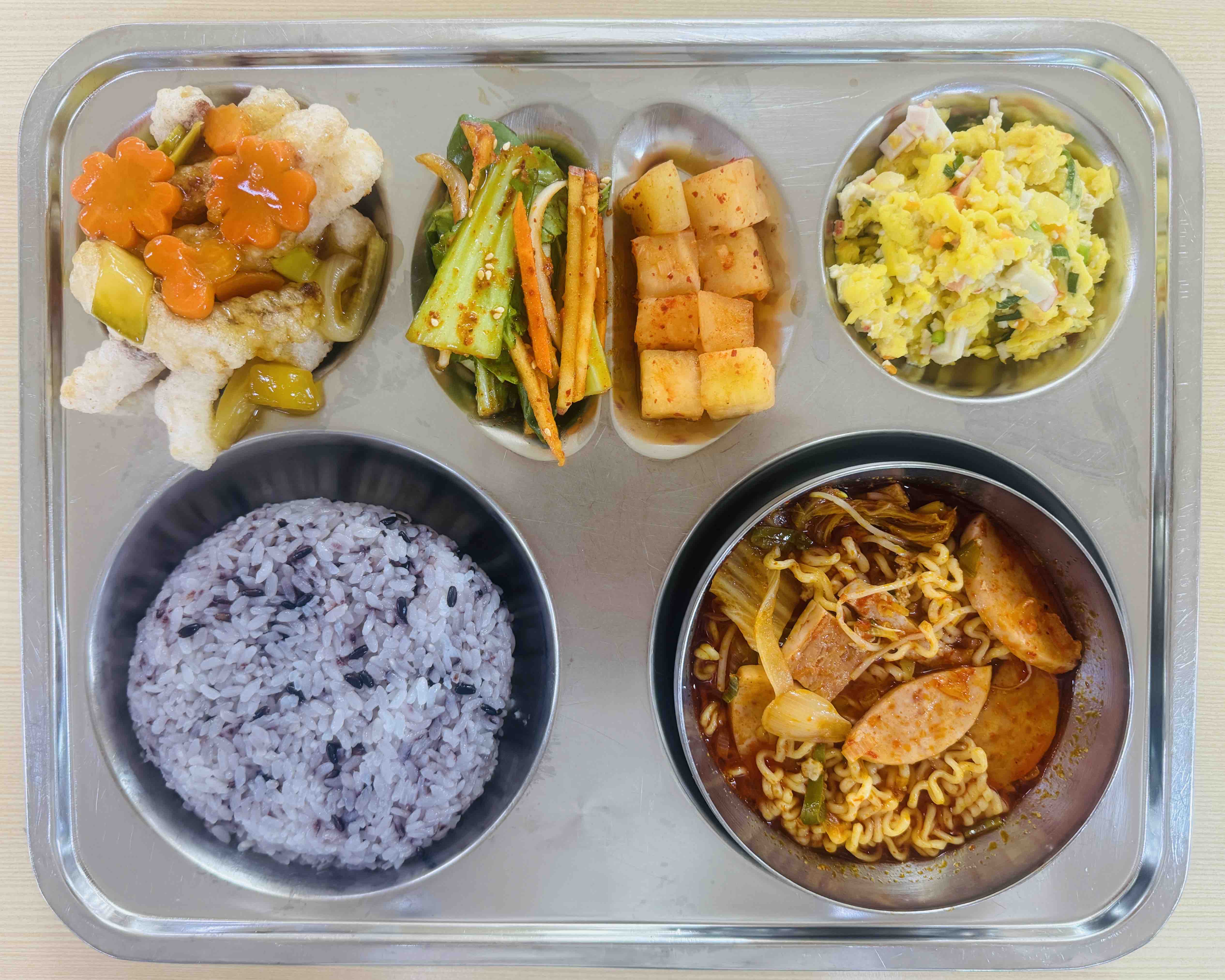 <중식>칼슘흑미밥 부대찌개&라면사리 오징어탕수 두부맛살달걀볶음 청경채겉절이 깍두기