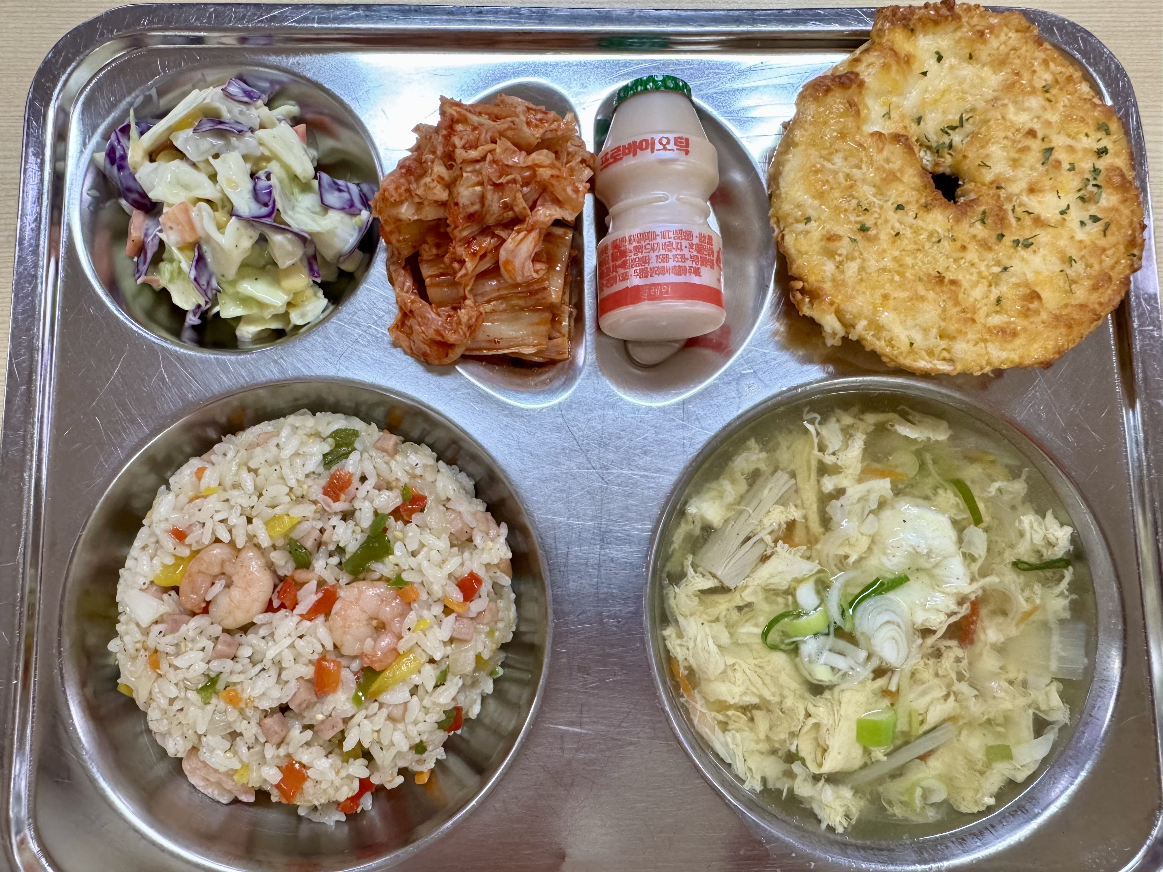 <조식>파프리카새우볶음밥 달걀파국 코울슬로 배추김치 명란베이글 요구르트