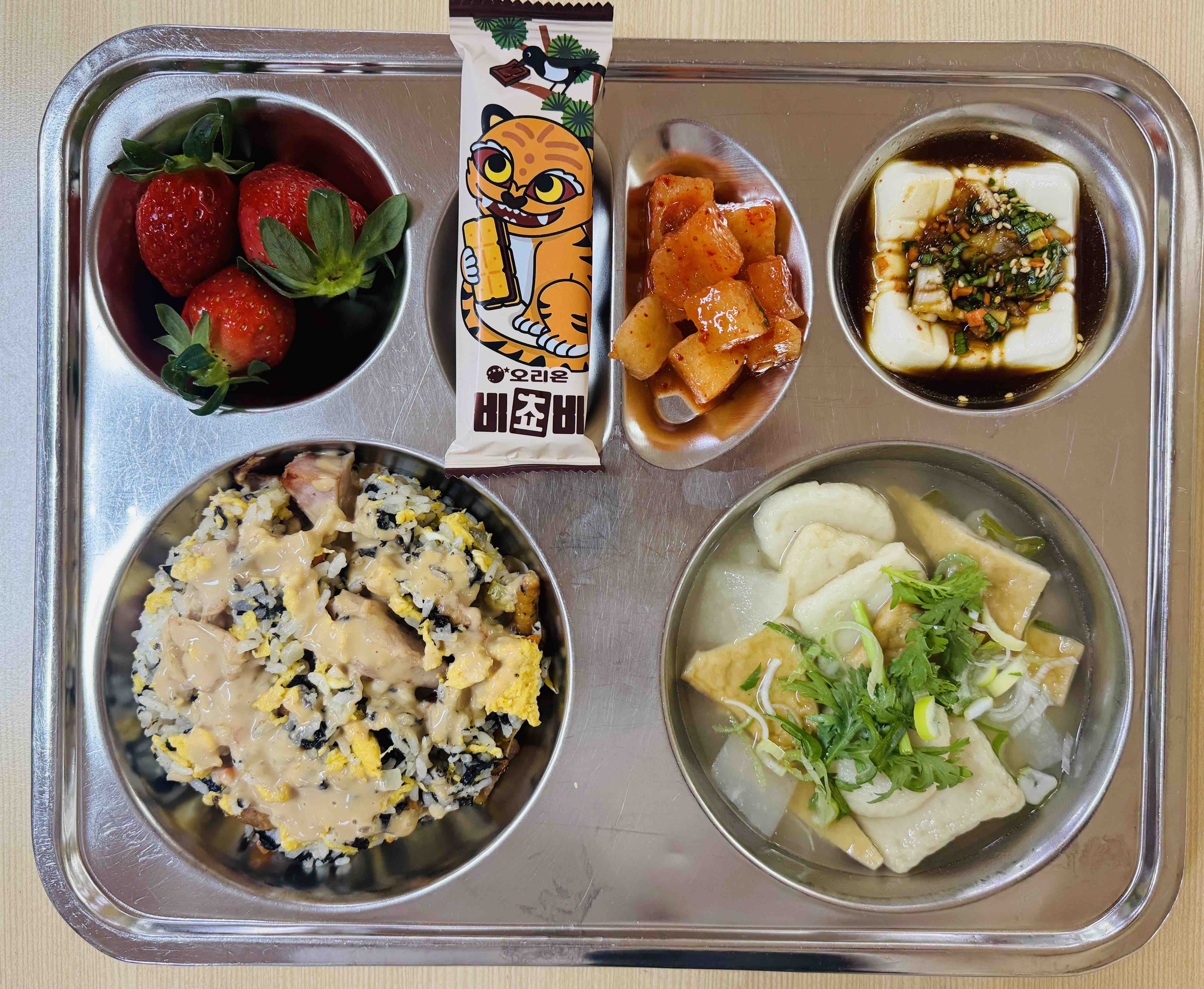 <조식> 허브치킨마요덮밥 어묵국 연두부&양념장 깍두기 비쵸비 딸기