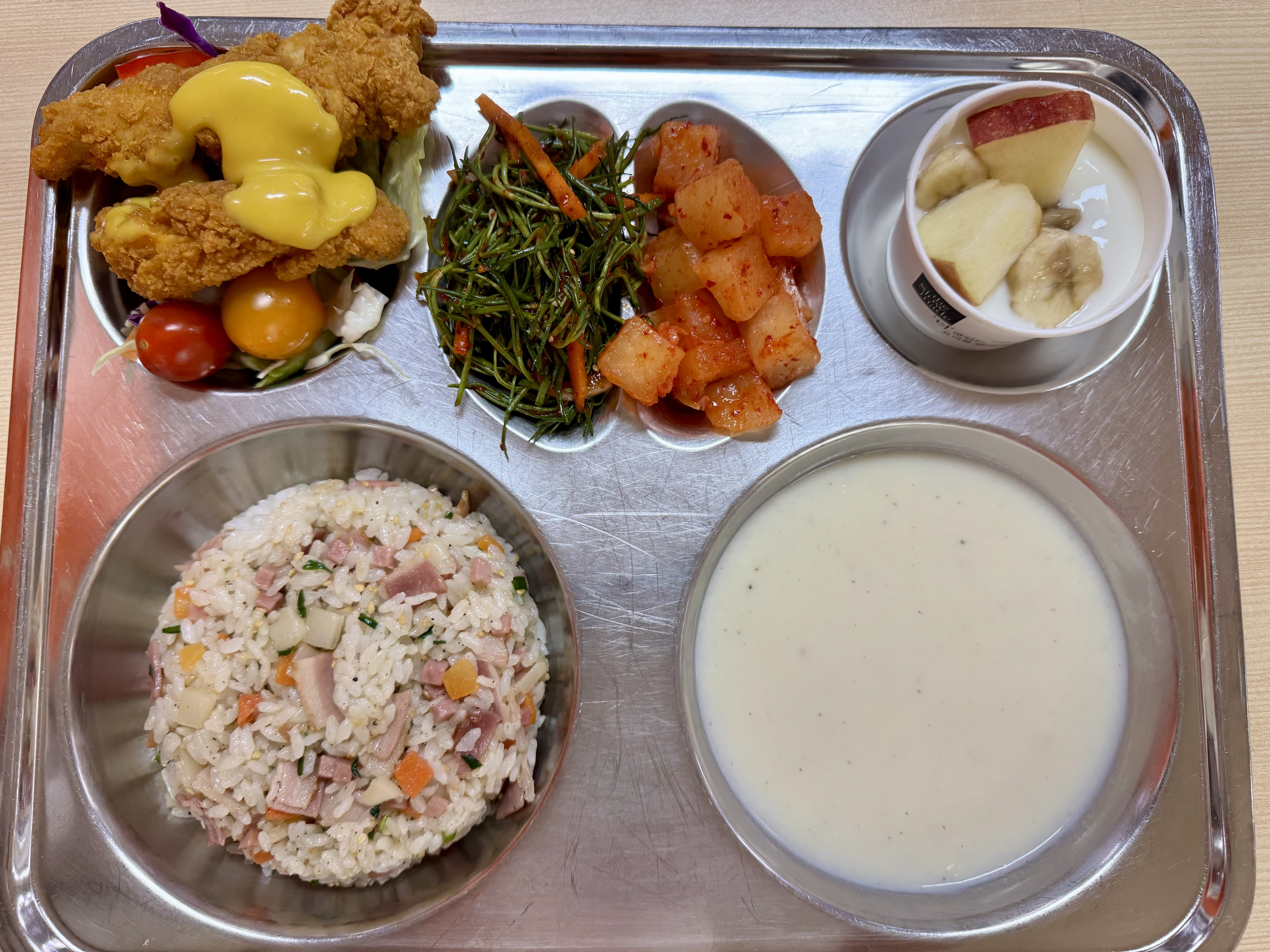 <조식>야채볶음밥 크림스프 케이준샐러드&허니머스터드드레싱 세발나물겉절이 깍두기 생과일요거트