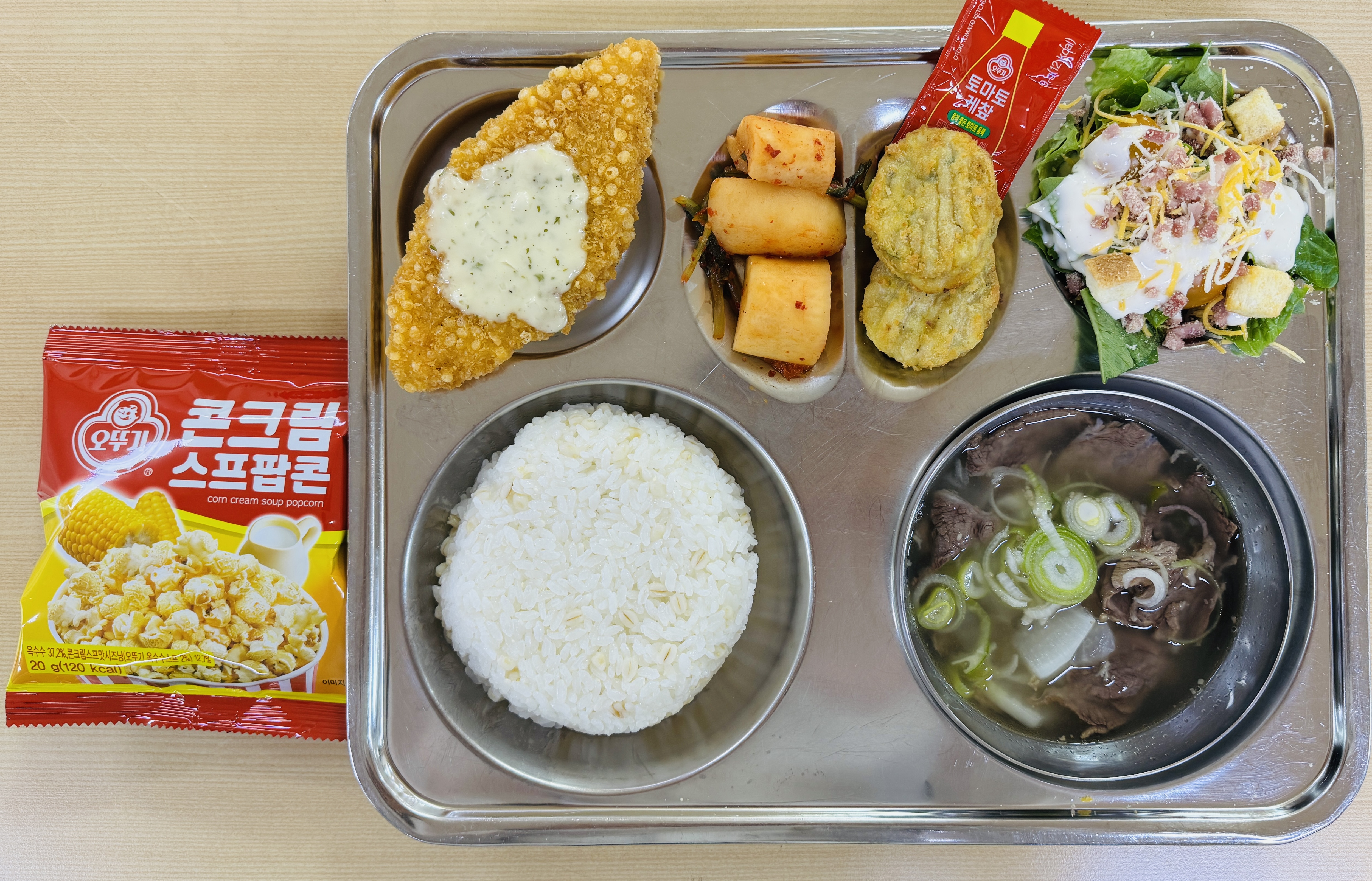 <중식>칼슘통밀밥 나주곰탕 크런치생선까스&타르타르소스 에그동그랑땡 시져샐러드 알타리김치 콘크림스프팝콘