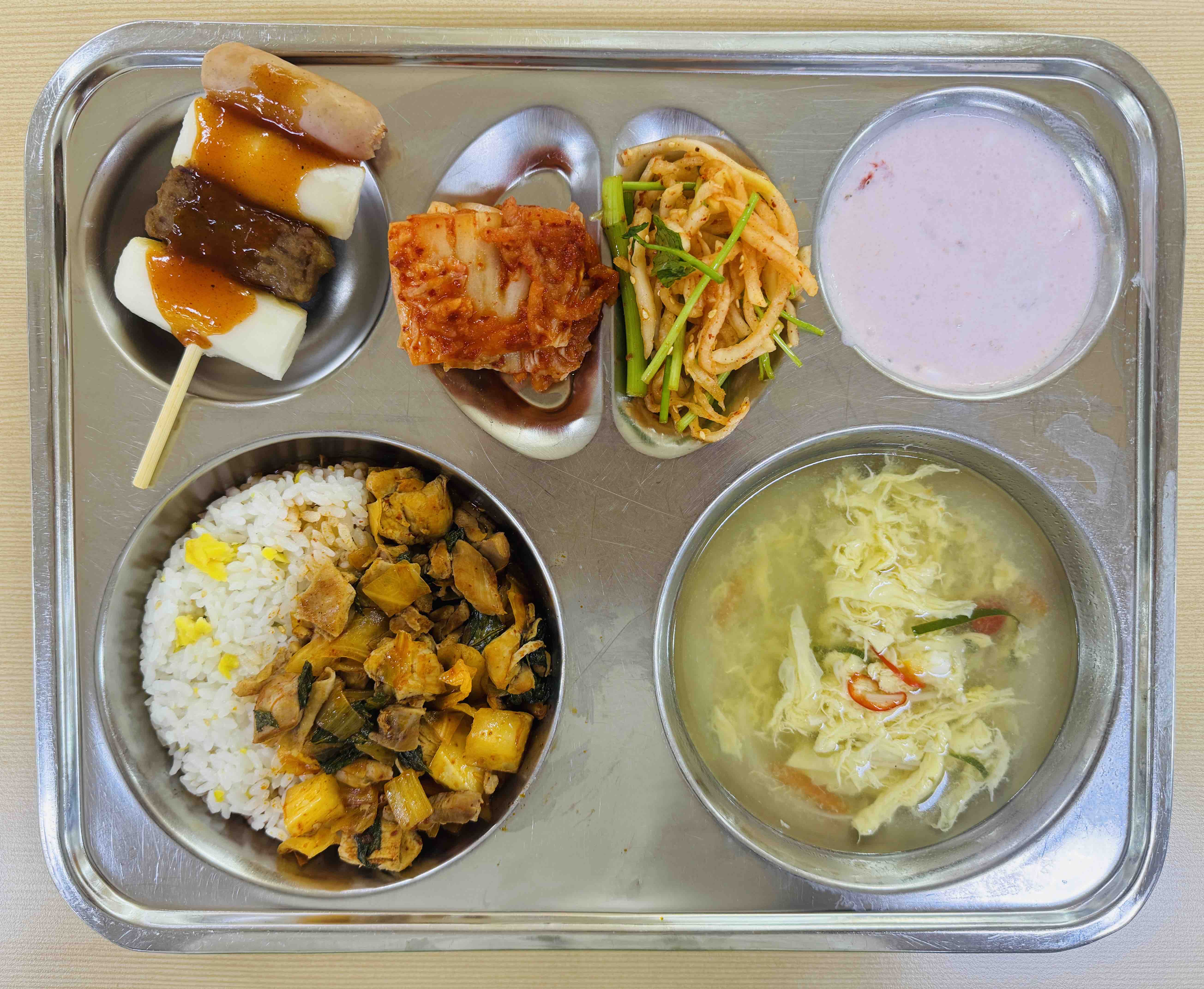 <석식>숯불치킨덮밥 달걀파국 갈떡꼬치 휘핑딸기범벅 미나리무생채 배추김치