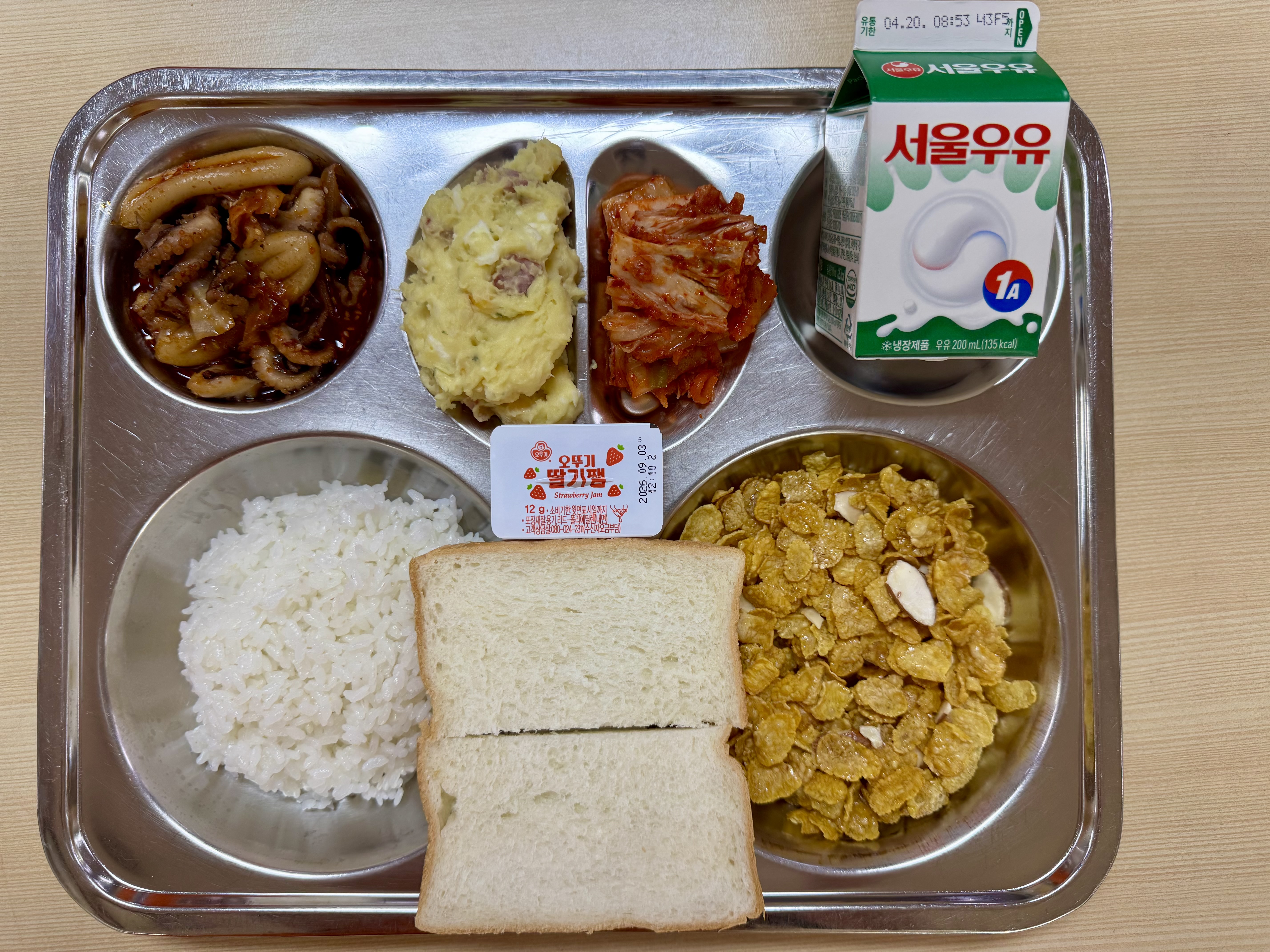 <조식>쌀밥 아몬드시리얼&우유 쭈꾸미볶음 고구마달걀범벅 배추김치 셀프토스트바(식빵)