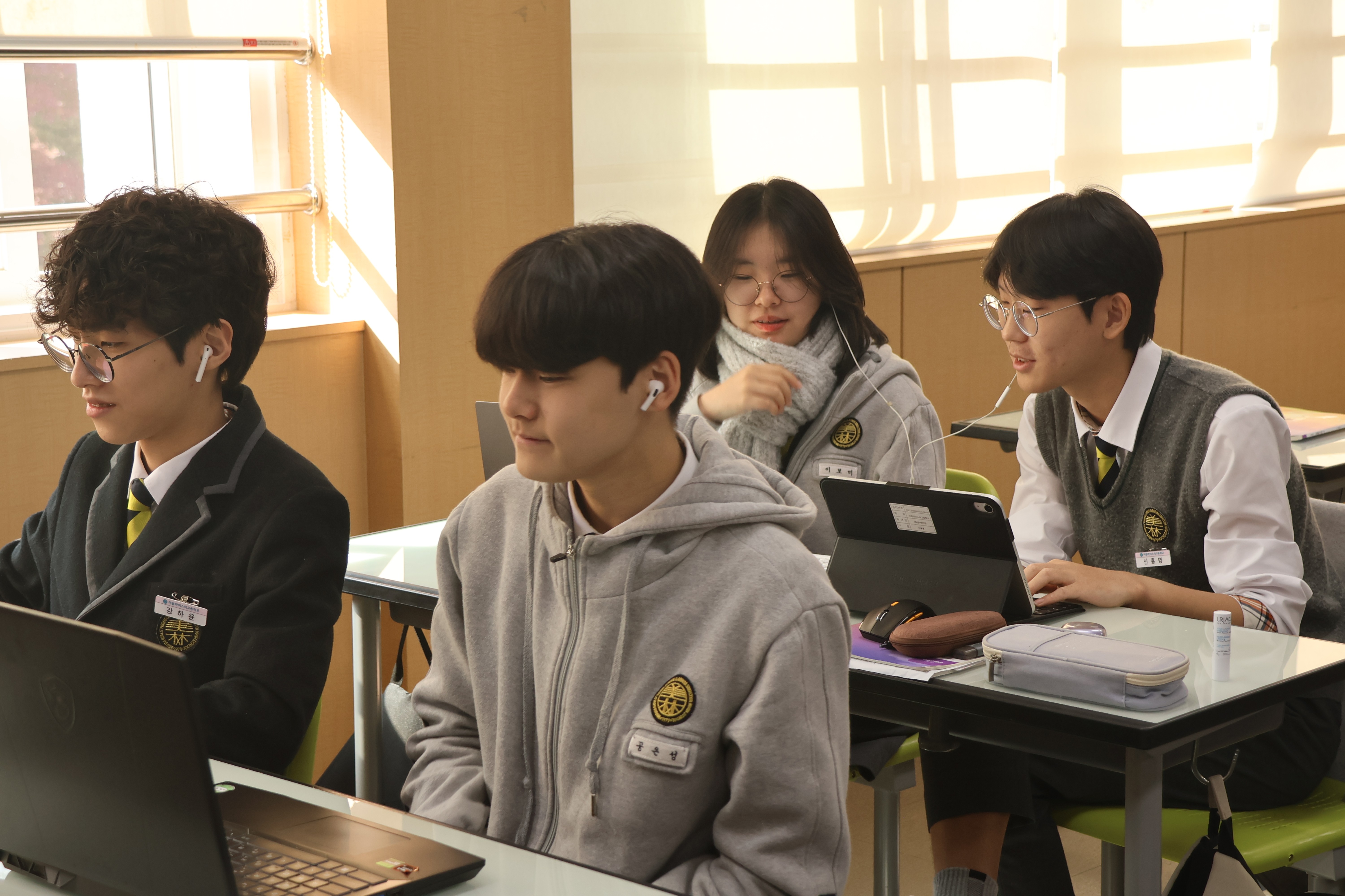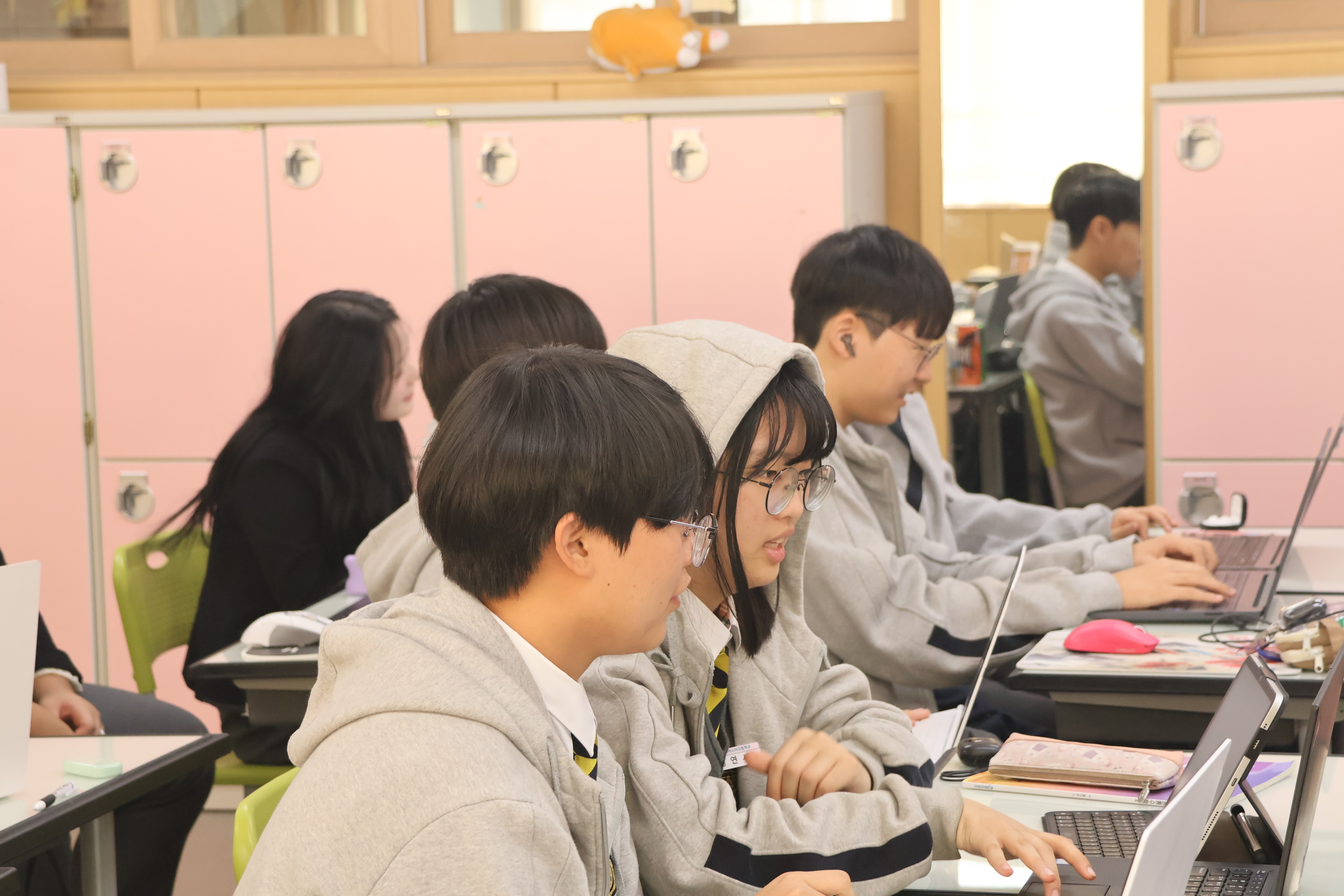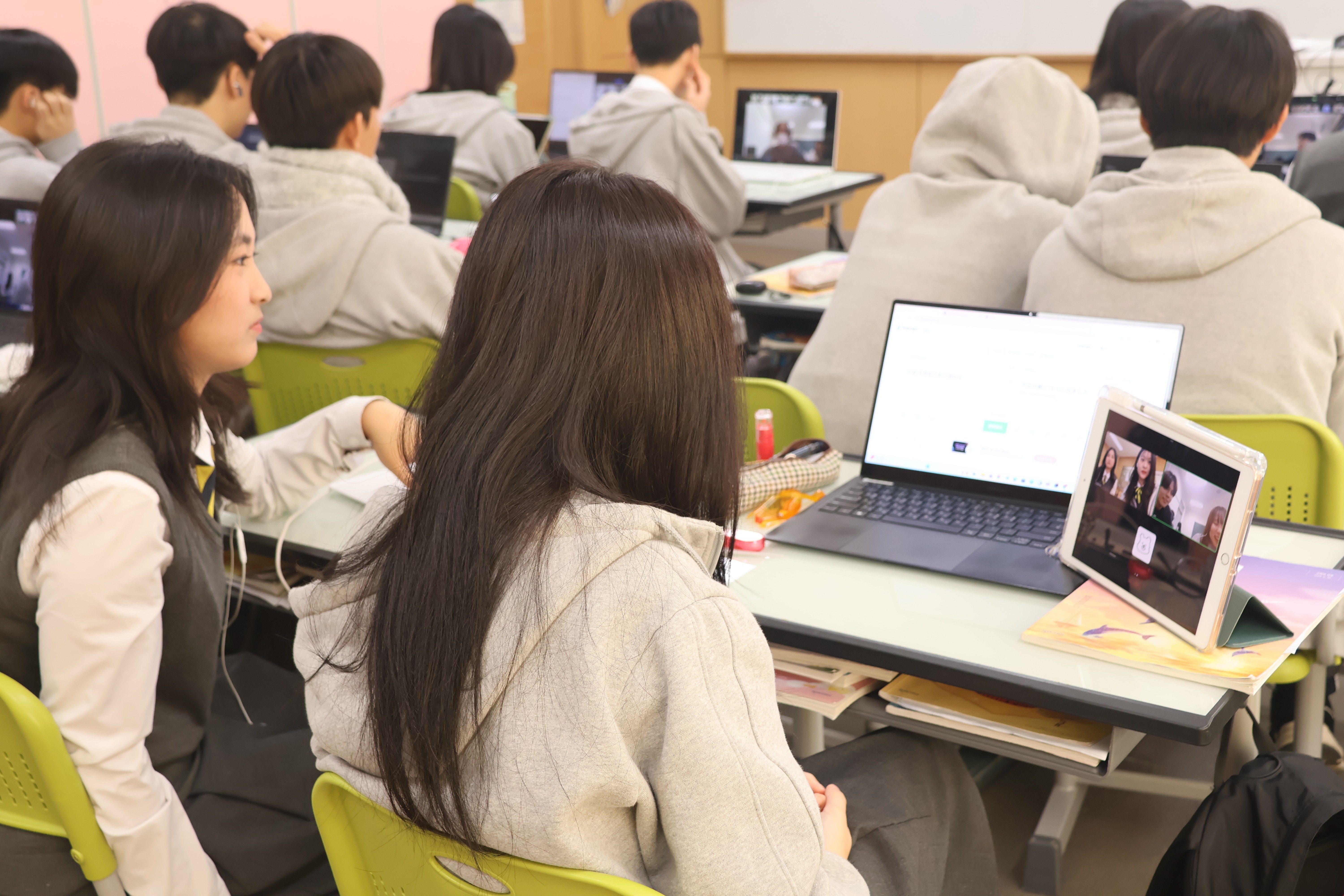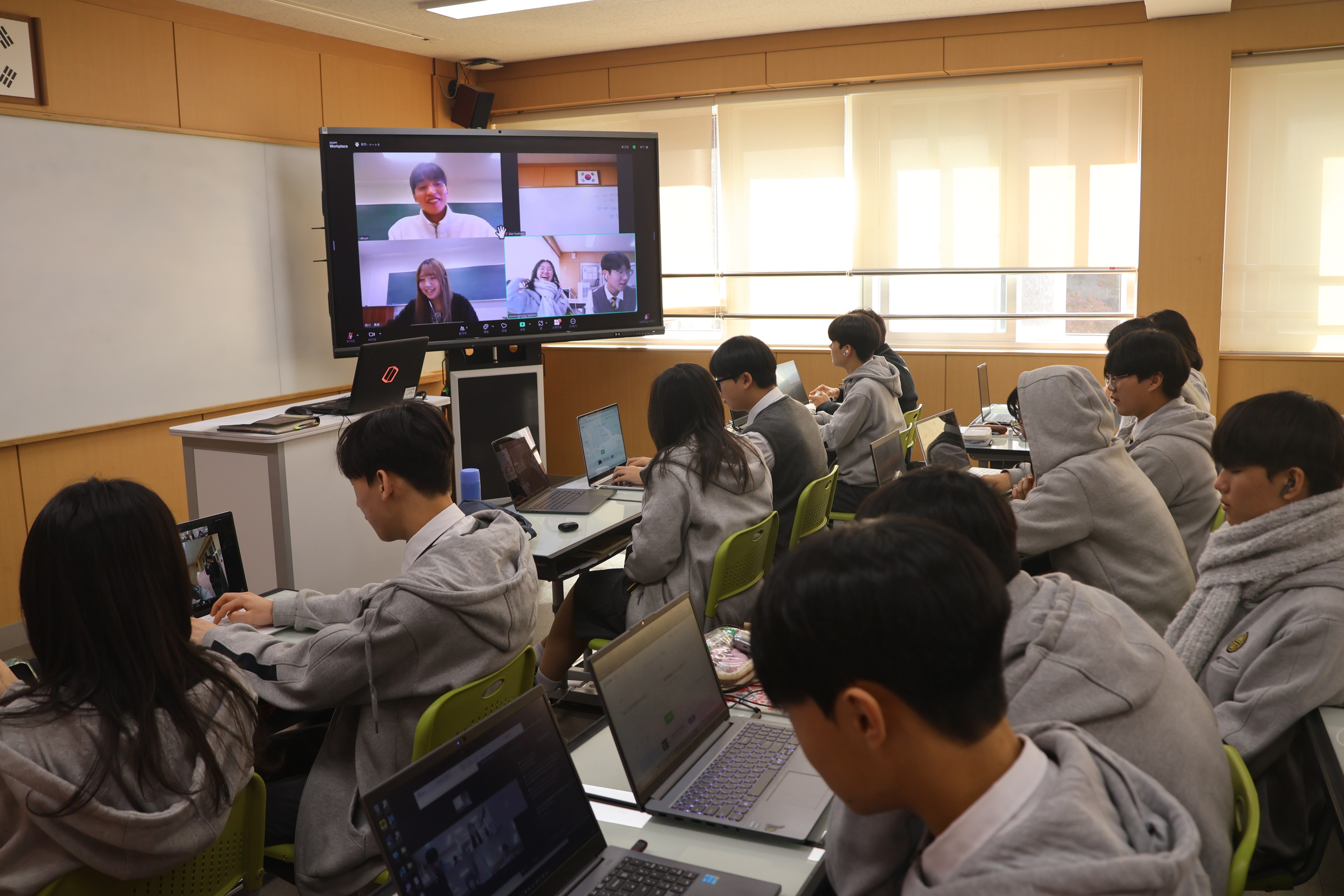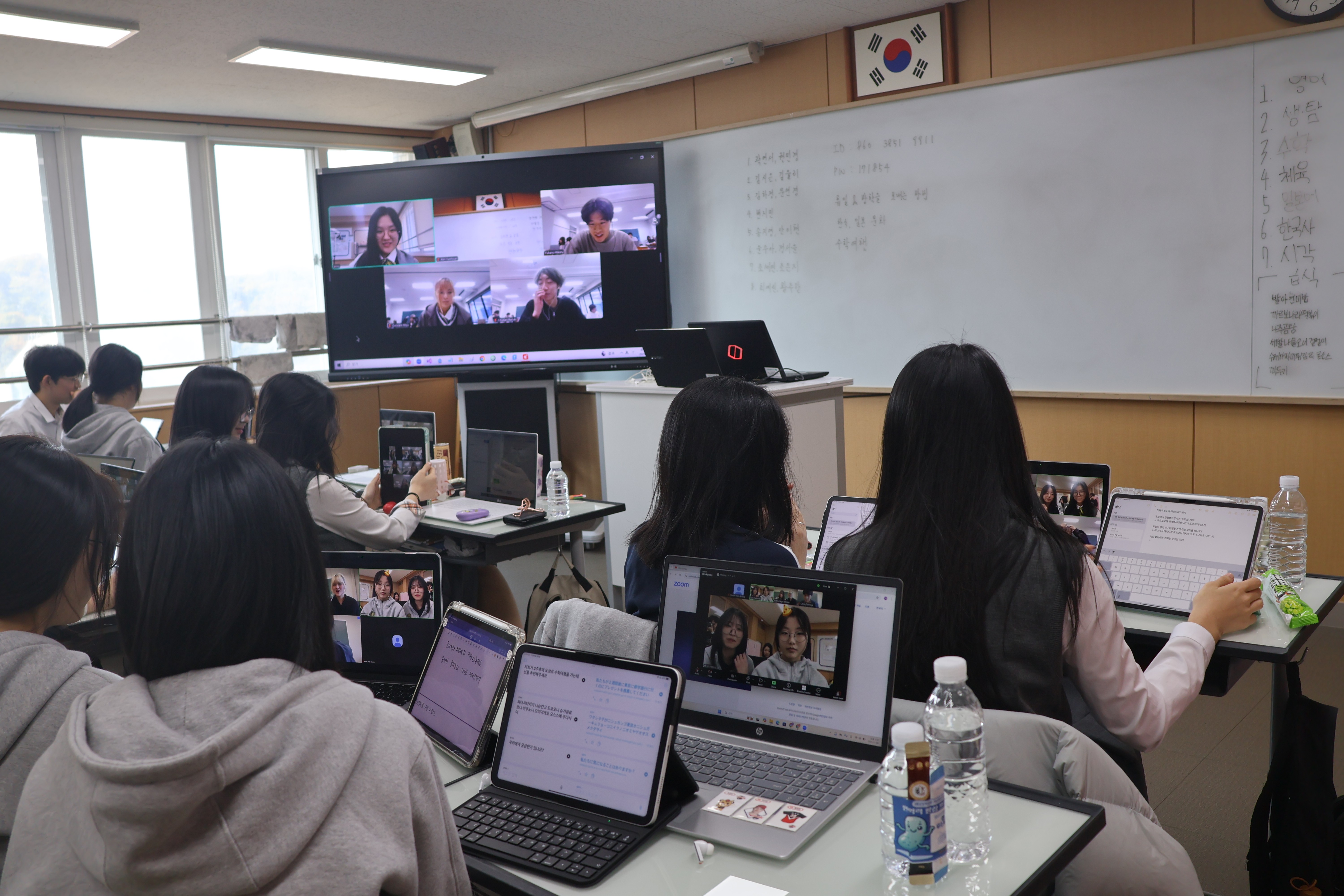 국제공동수업의 일환으로 일본 가나자와대학교에서 한국어를 배우고 있는 학생들과 우리학교 1학년4반, 1학년6반 학생들이 온라인으로 수업교류를 하였습니다.